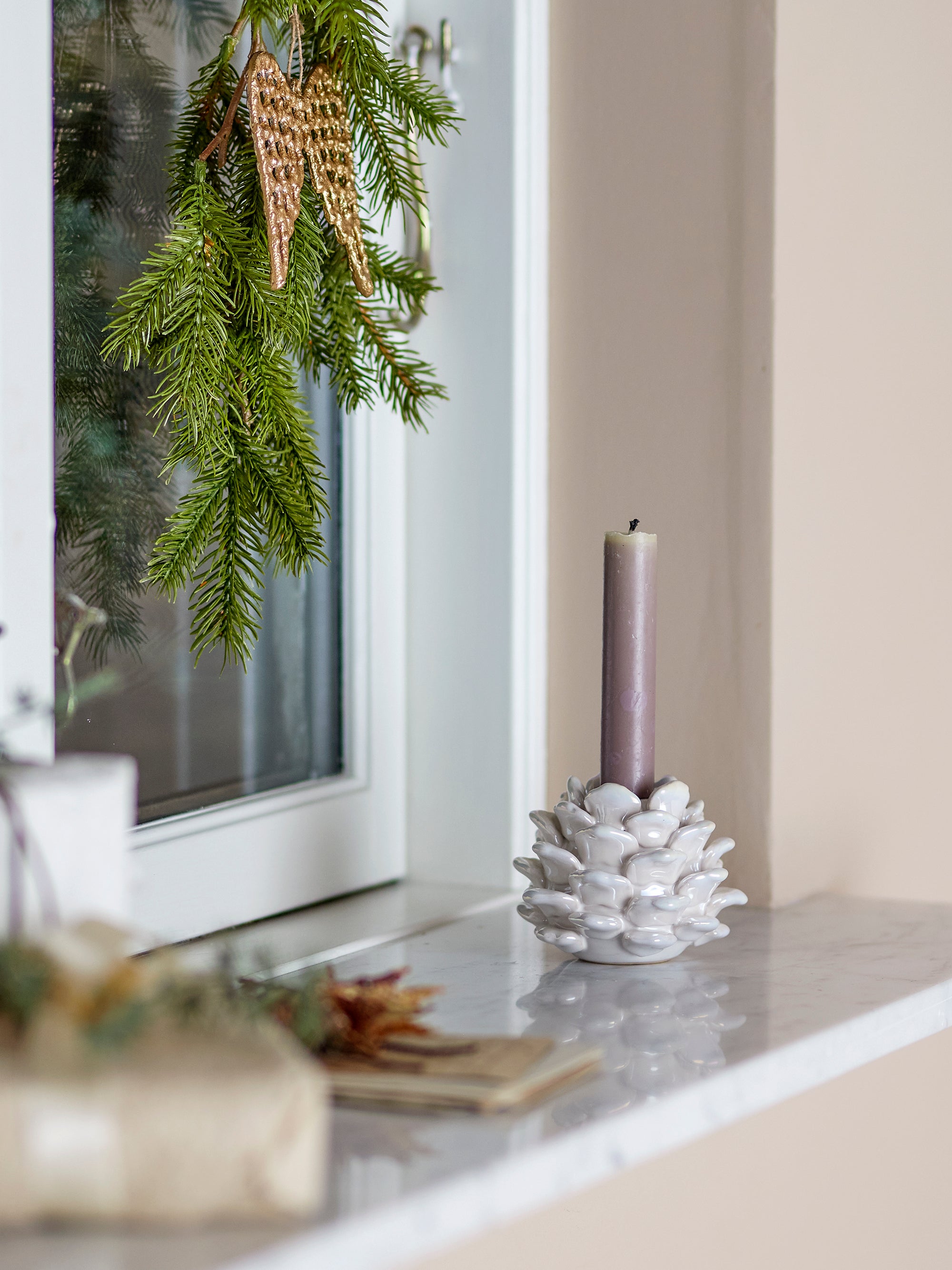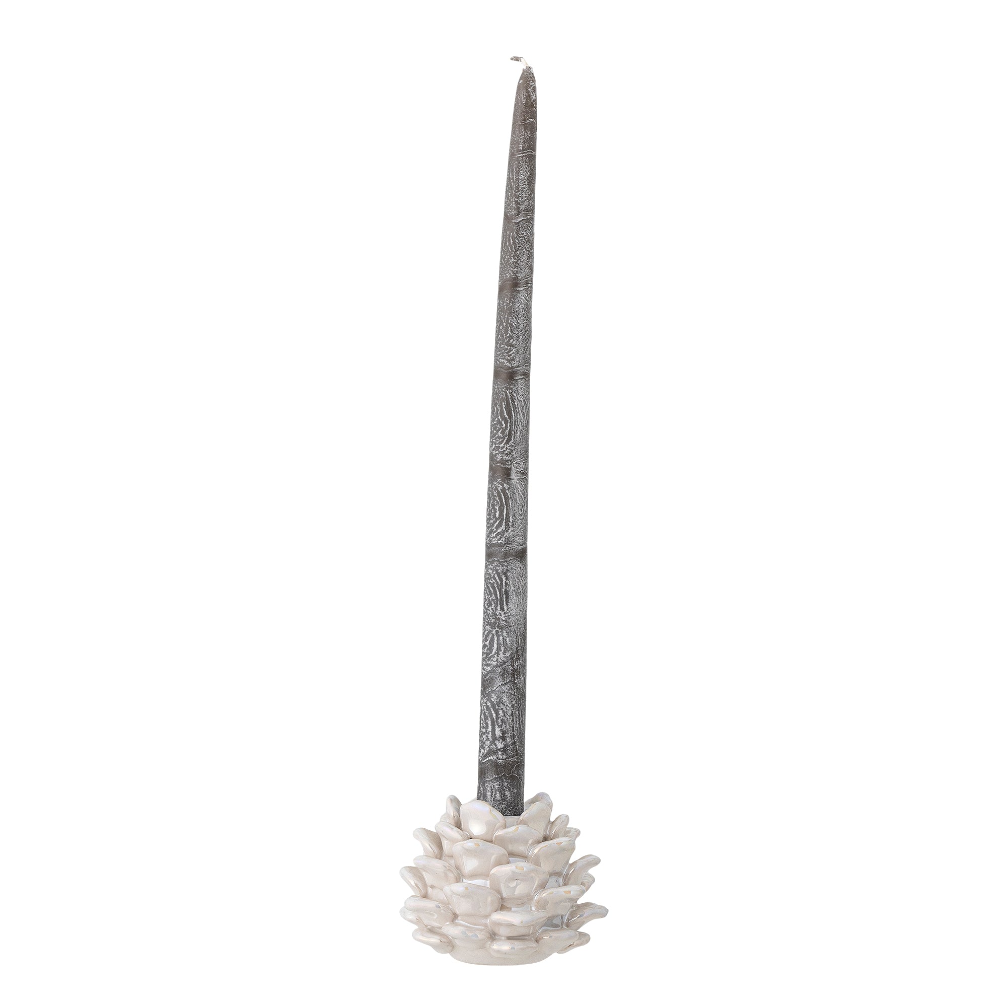 Kogle lysestage med perlemors glasur. Lysestagen er ideel som et midtpunkt på en hylde eller et bord. Til kronelys