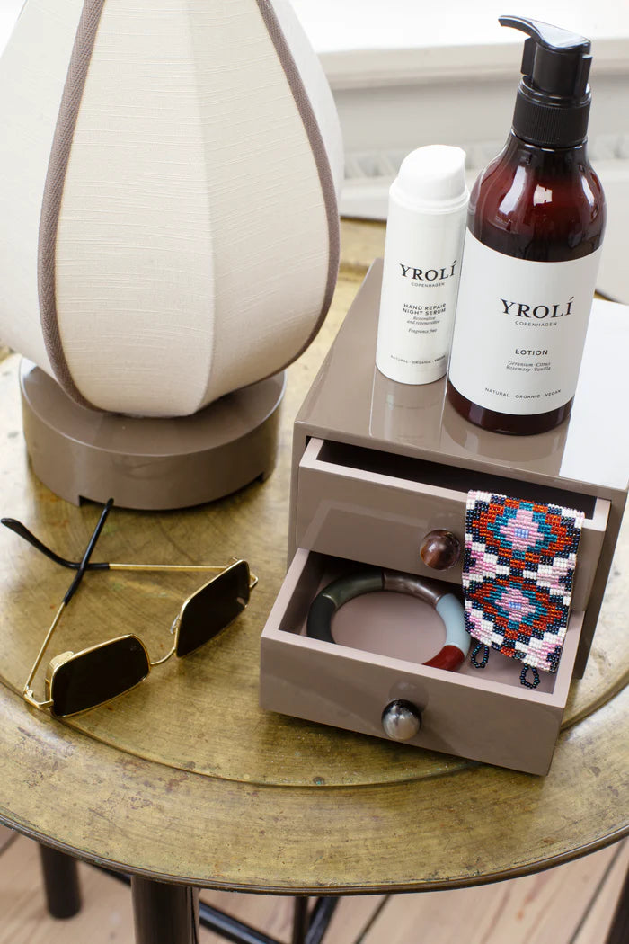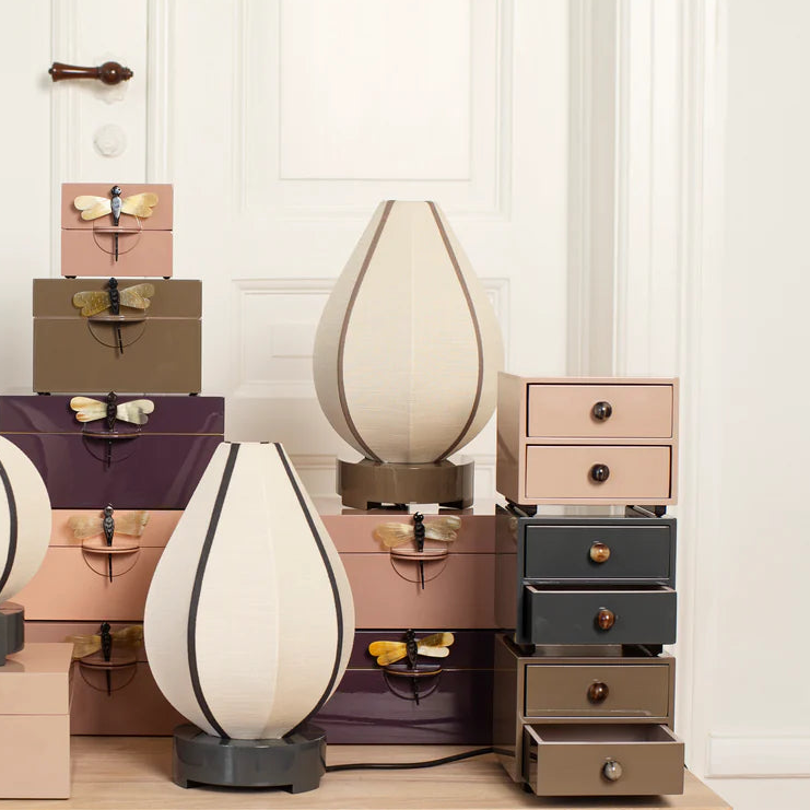 Giv dit hjem et elegant og stemningsfuldt lys med Lotus Bordlampe fra Oi Soi Oi. Med sin smukke form og harmoniske farvekombination i Earth + Sand / Earth bånd, tilføjer denne lampe både varme og karakter til rummet. Lampen består af en lampefod i lakkeret MDF-træ med 13–15 lag lak, der giver et eksklusivt finish og en solid base. Skærmen er lavet i råsilke med bomuldsbånd, som skaber et blødt, behageligt lys og et dekorativt udtryk.