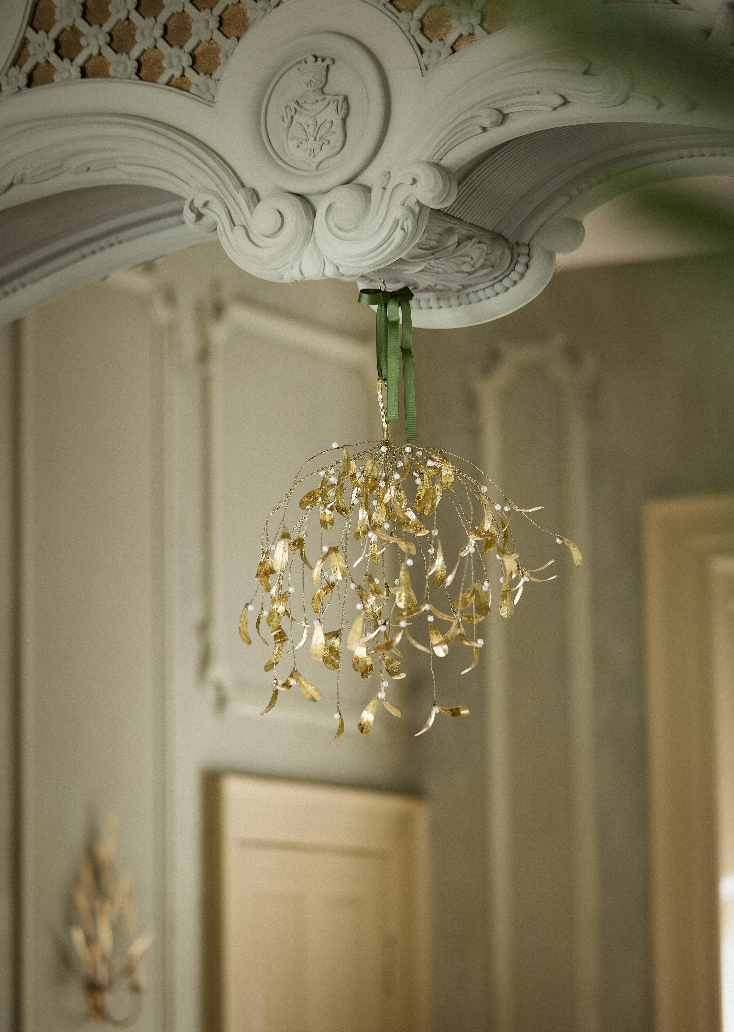 Eventyrlig mistelten i guld med perler – En moderne klassiker til julen.