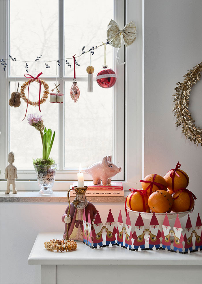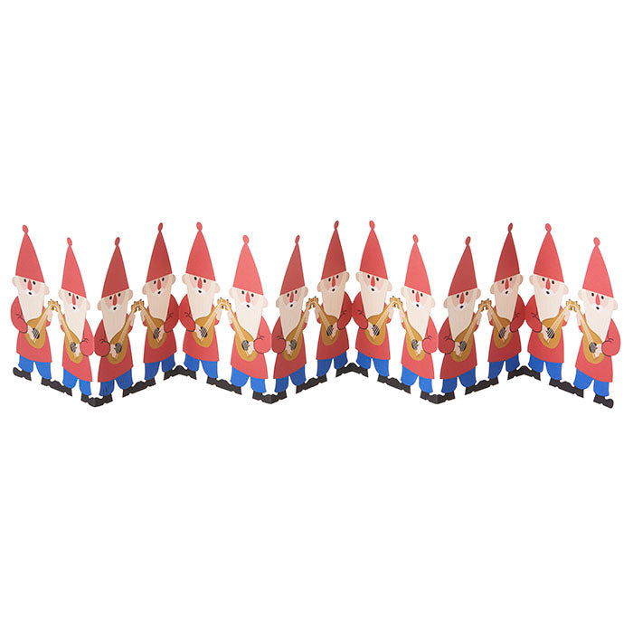 Charmerende bordguirlande med nisser og fine udskæringsdetaljer.