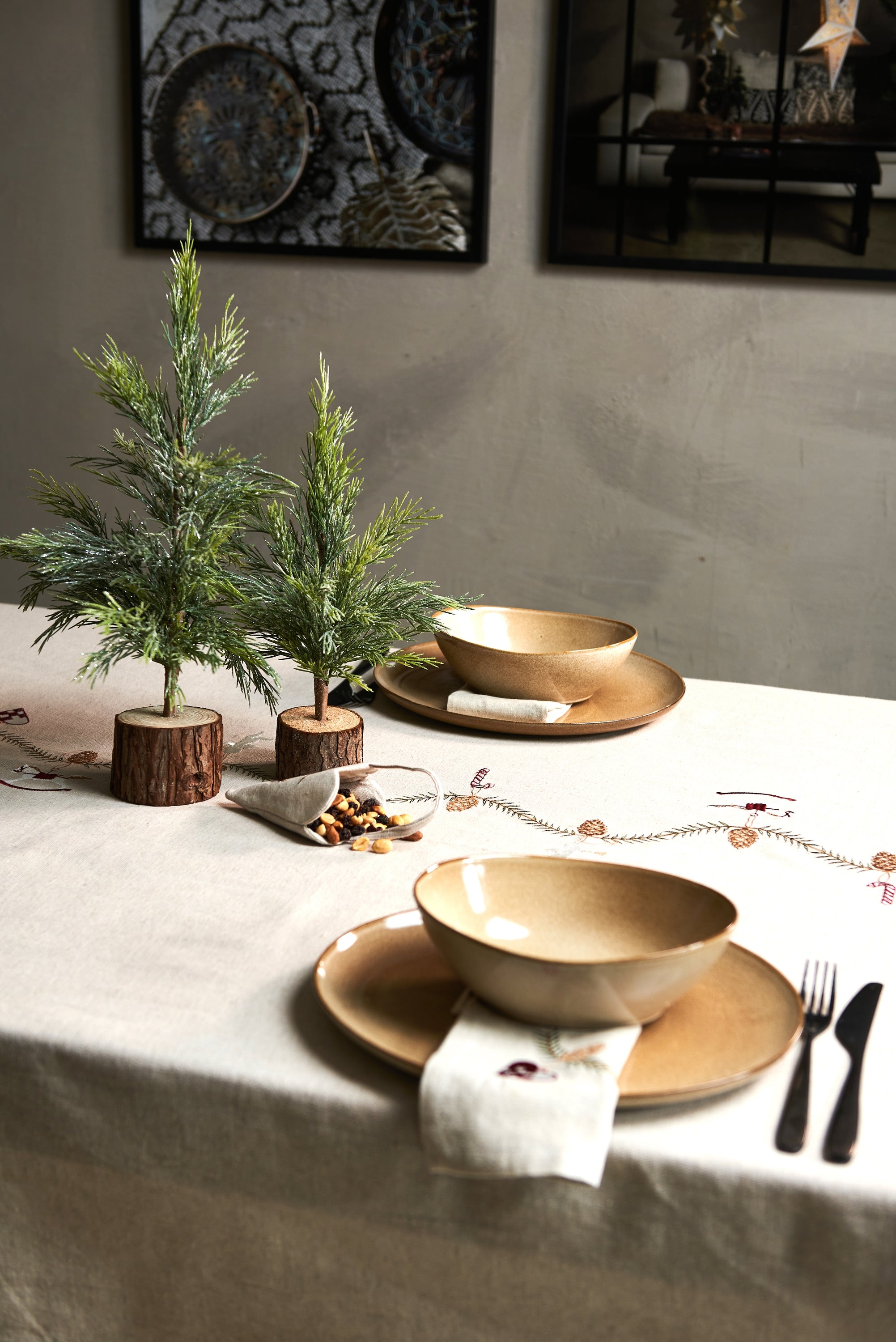 Denne juledug i hør er den perfekte base for et smukt og hyggeligt julebord. Med de fineste broderede julemotiver – julehjerter, kogler og slikkepinde – bringer dugen en klassisk og nostalgisk julestemning ind i hjemmet. Hørmaterialet giver dugen et naturligt og charmende udtryk, der let kan matches med både traditionelle og moderne bordopdækninger.
