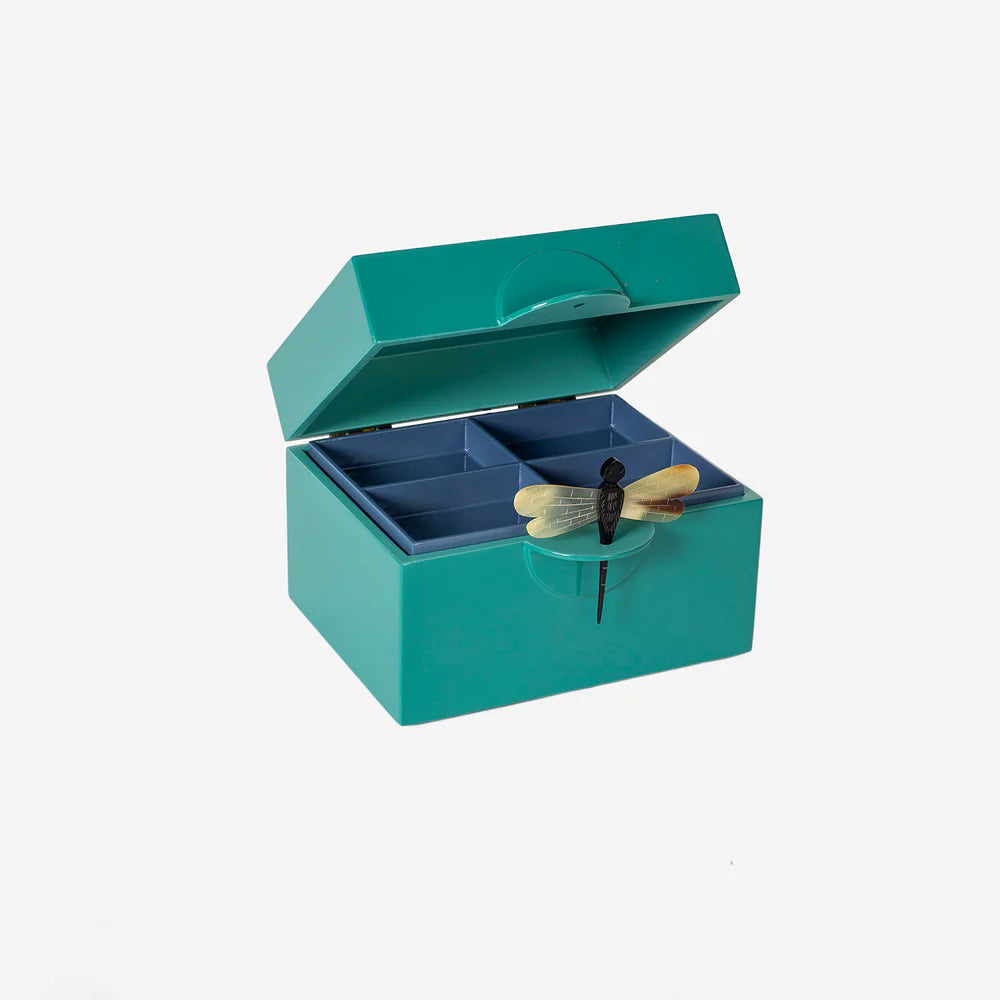 Super smukt smykkeskrin fra det Oi Soi Oi, der kombinerer elegance og funktionalitet. Hvert skrin er håndlavet og lakeret 13-15 gange for at opnå den høje kvalitet. De elegante smykkeskrin er den perfekte opbevaring til dine mest værdsatte smykker eller minder. Skrinene lukkes med en elegant og unik guldsmed lavet af bøffelhorn, der tilføjer et eksklusivt og luksuriøst præg. Den dyrebare lakæske er ikke kun praktisk, men også så stilfulde og smuk at den fortjener at stå fremme. Smykkeskrinet er ideelle til at beskytte dine smykker, billeder, minder, babys håndaftryk og samtidig give et sofistikeret touch til dit hjem. "Dragonfly" smykkeskrinnet for et luksuriøs skrin, der både er smuk og holdbar - den perfekte gave til en du holder af.