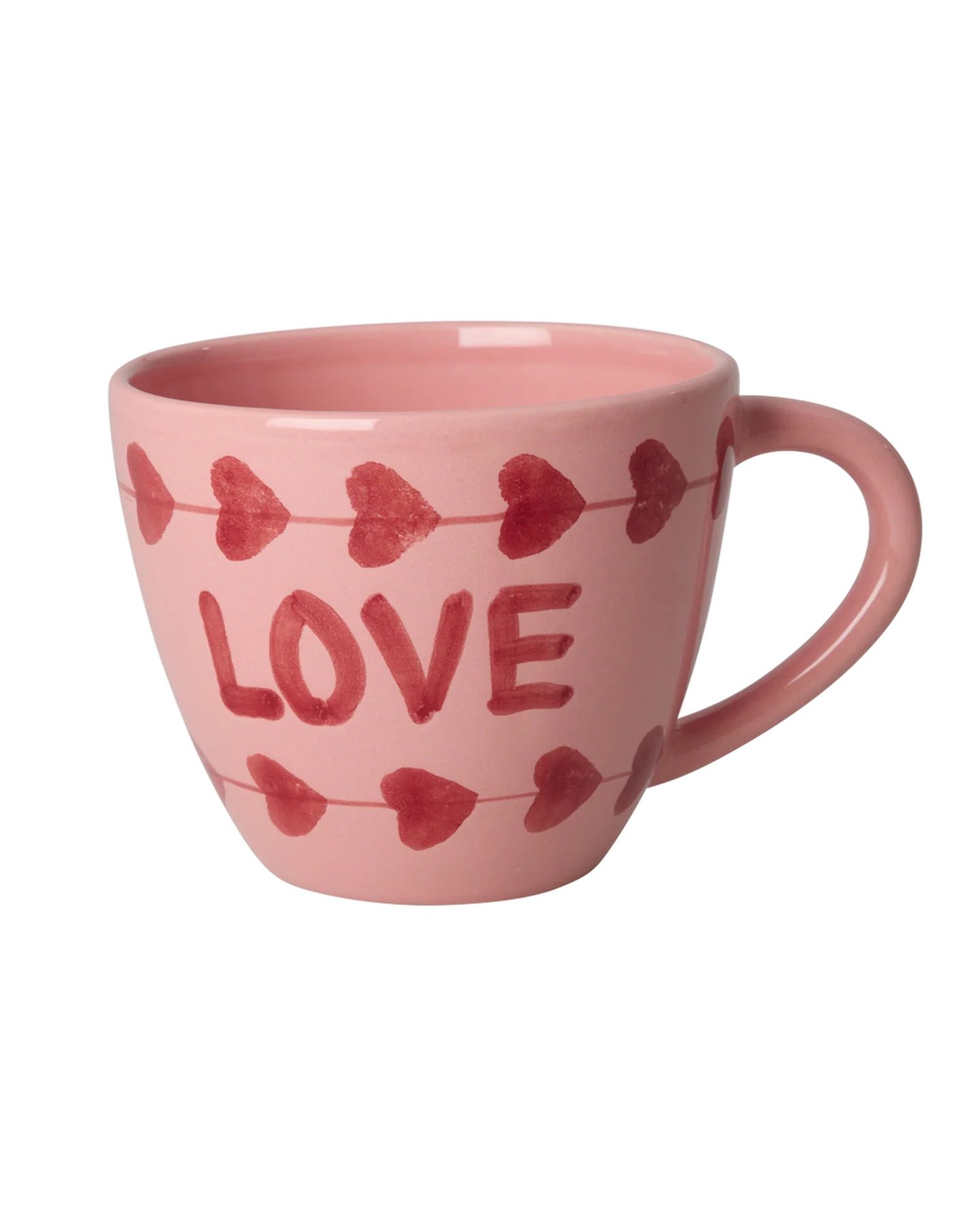 En del af den smukke håndmalede keramik kollektion fra Rice. Denne smukke kollektion byder på et charmerende udvalg af kopper, krus, tallerkner, skåle og tekander, der alle er prydet med delikate motiver som blomster, striber, firkløver og hjerter. Hver enkelt genstand er omhyggeligt udformet og malet i hånden, hvilket sikrer, at hver del er unik.