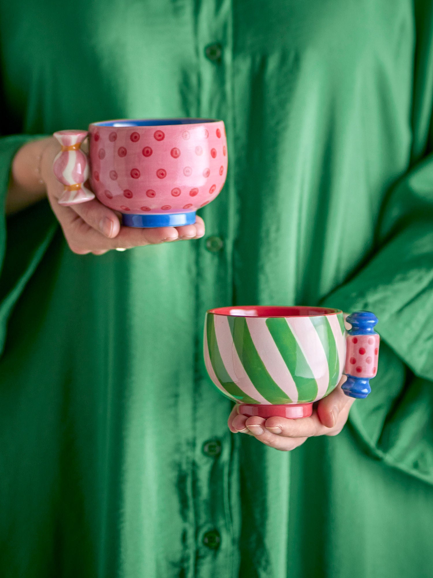 Caramella Koppen fra Bloomingville er en charmerende tilføjelse til hverdagen med sit farverige og legende design. Fine håndmalede detaljer i friske farver. Perfekte til at nyde morgenkaffen eller en varm kop te, mens de skaber en indbydende og stemningsfuld atmosfære. Eller brug dem som slikskåle.