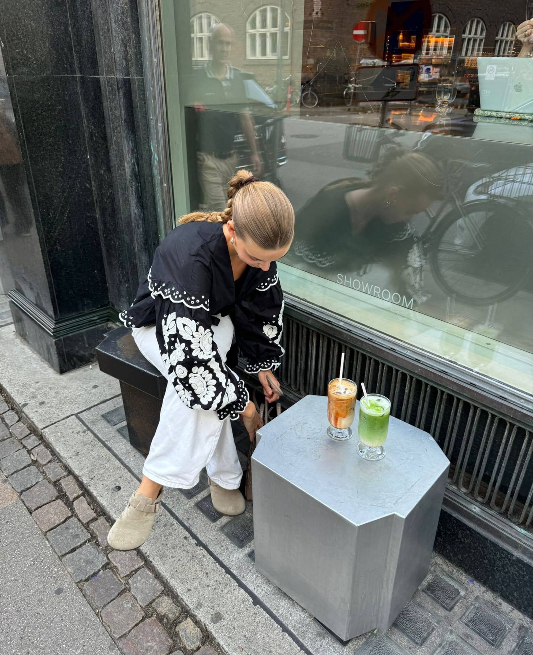 Designet har drop shoulders og brede ballonærmer, som skaber en moderne og afslappet silhuet. Ærmerne afsluttes med elastik indvendigt, hvilket giver volumen og et elegant udtryk. Skjorten er åben foran og bindes med to sæt fine sløjfebånd, der tilfører et romantisk og personligt touch.