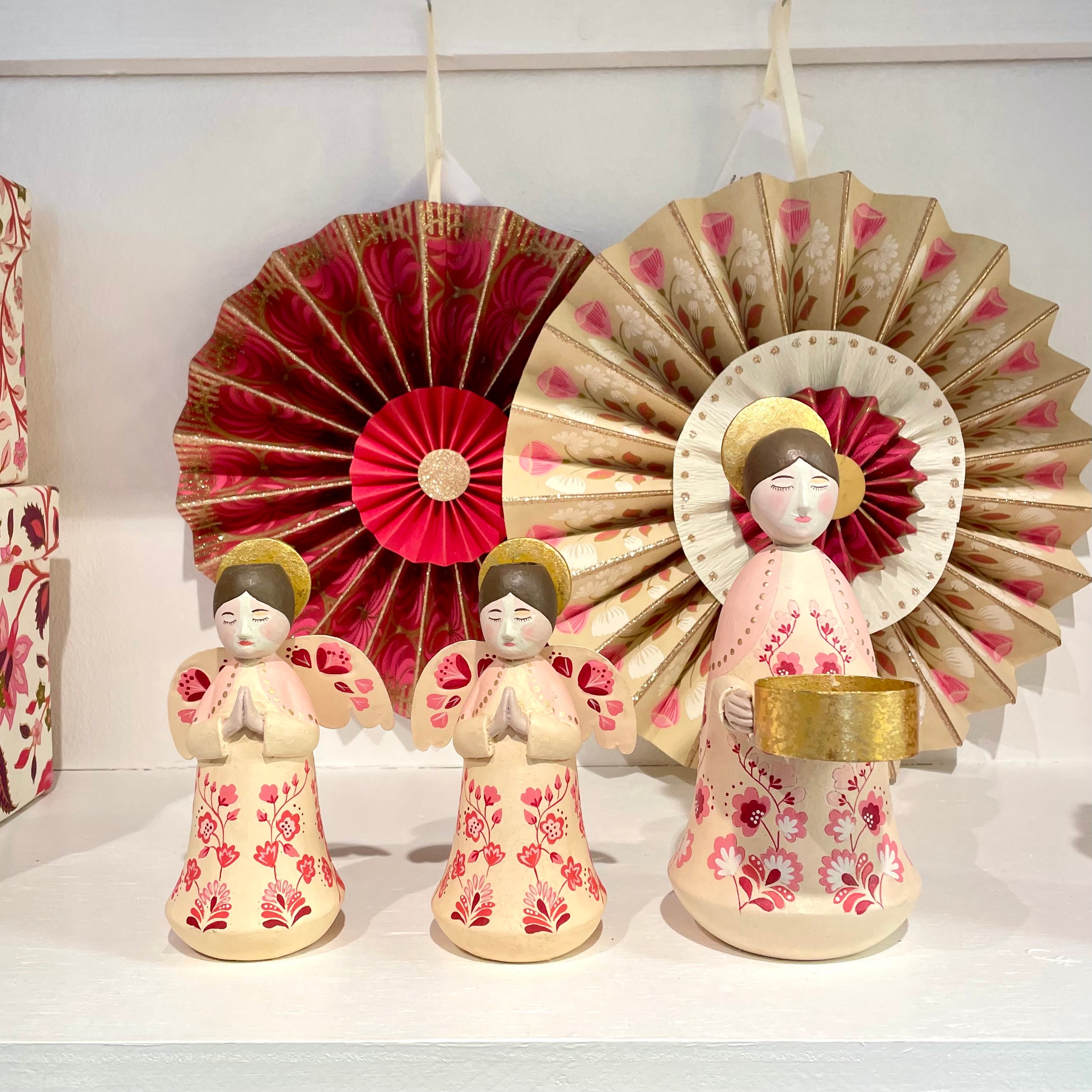Denne smukke engel lysestage med antikt udseende bringer et strejf af nostalgi ind i dit hjem. Med sine delikate, håndmalede detaljer og bløde farvekombinationer af beige og røde nuancer er Marigold englestagen både nostalgisk og charmerende. Hver lysestage er håndstøbt, hvilket giver et unikt præg og gør dem til noget særligt. Den elegante figur er til julelys, men pynter lige så smukt uden.