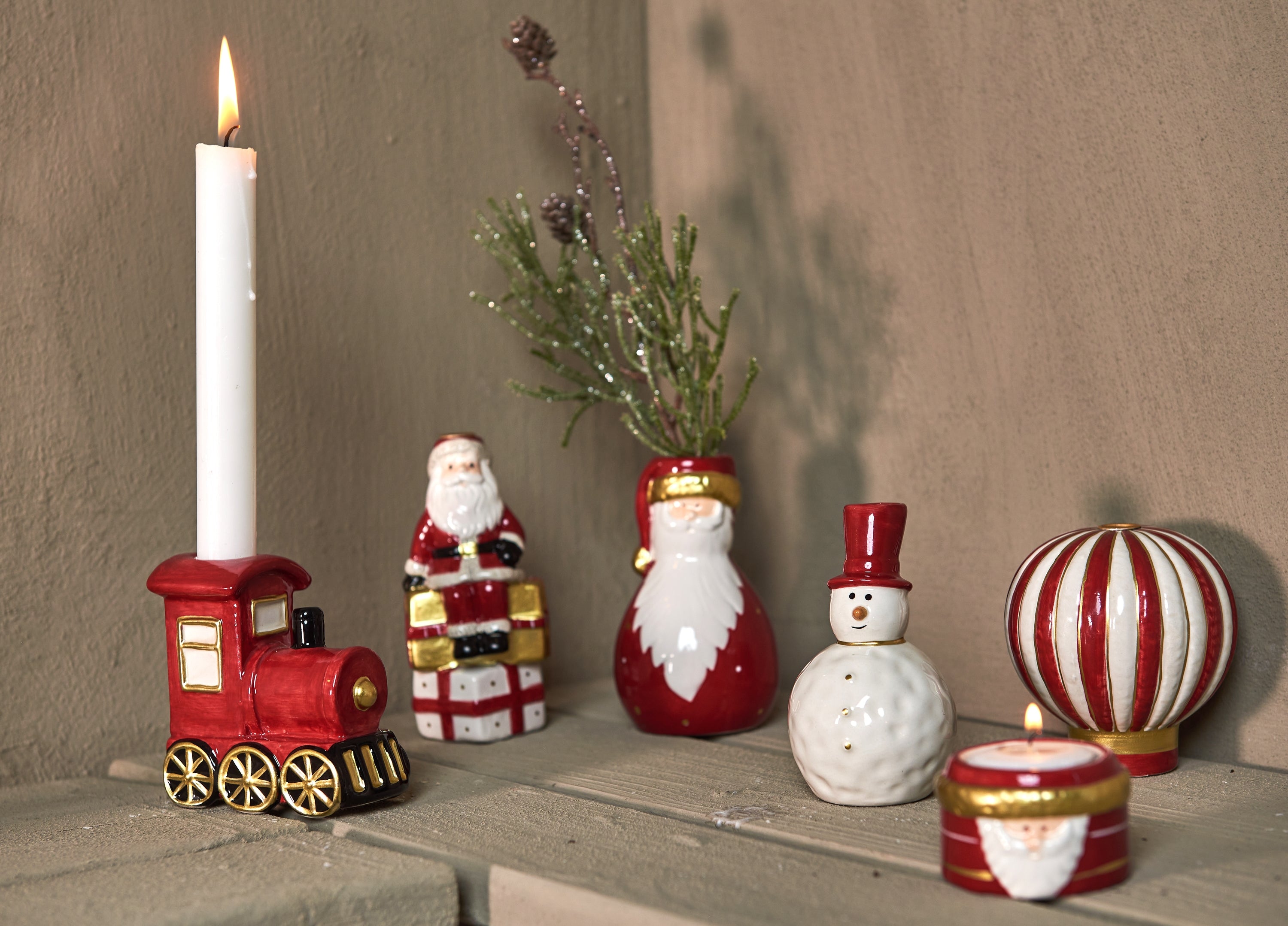 Keramik lysestage med røde og hvide striber til kertelys/juletræslys.