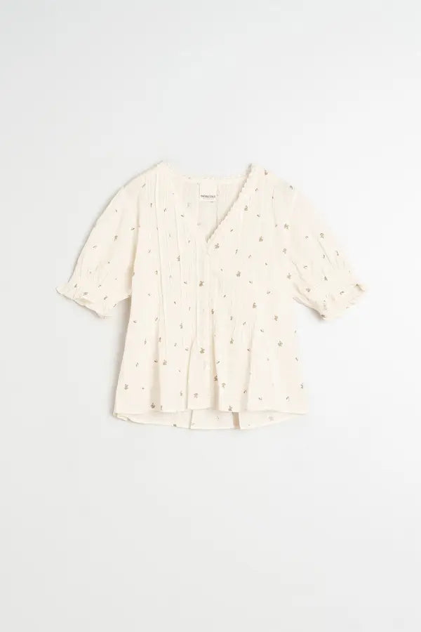 En sød skjorte fuld af fine detaljer og blomstermotiver. Den har elastiske ballonærmer, V-hals med blondekant og læg i taljen for en superfeminin silhuet.