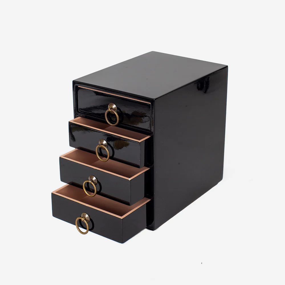 Denne lille, lakerede kommode er både praktisk og dekorativ – perfekt til opbevaring af smykker, små accessories eller andre fine småting. Med sine 4 skuffer giver den god mulighed for at organisere ringe, armbånd, øreringe osv, så det hele er samlet ét sted og let at finde.