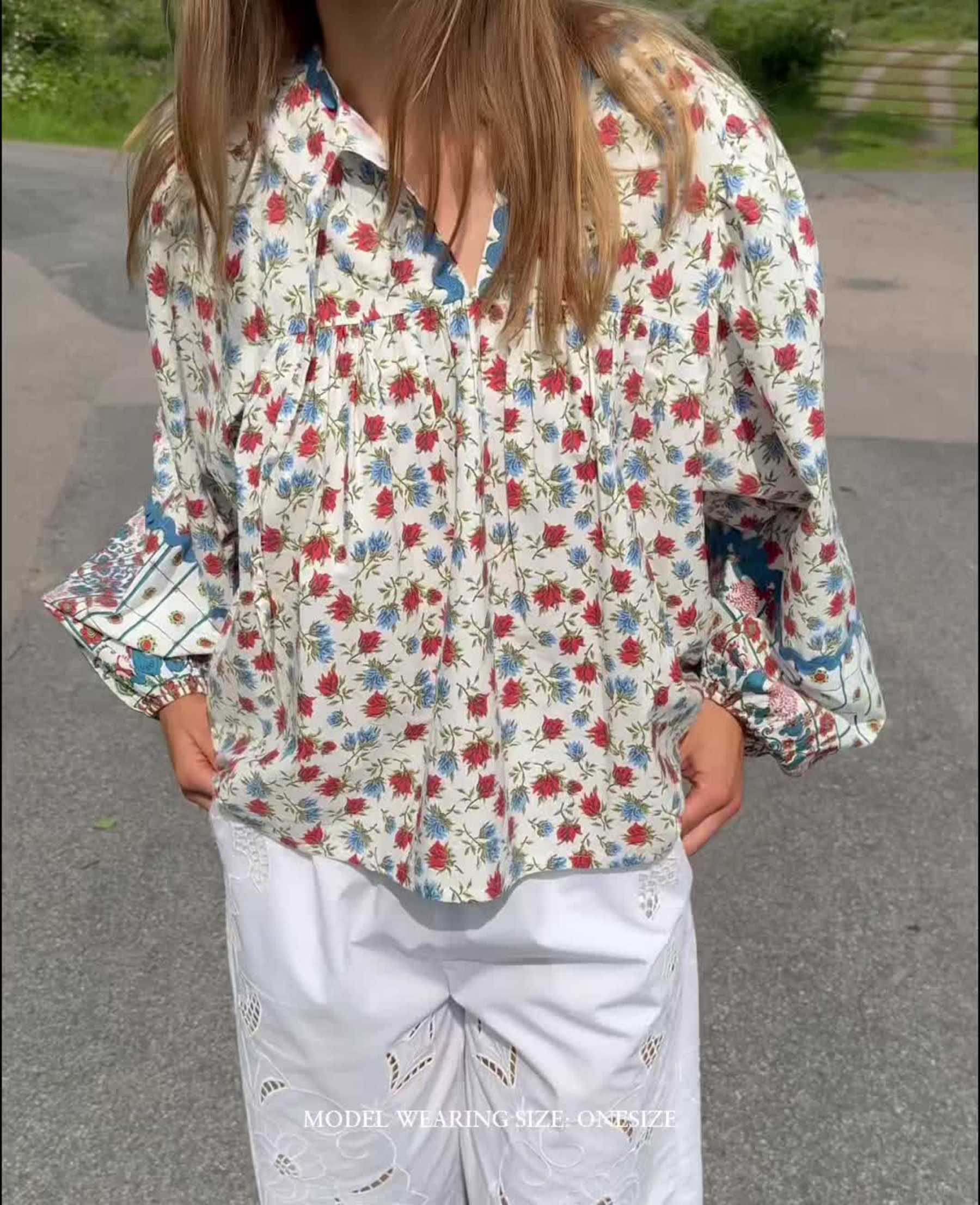 Skjorten har lange ballonærmer med elastik ved manchetterne, som giver et blødt og elegant udtryk. Den runde halsudskæring er designet med en lille slids foran og bindebånd, der tilfører et romantisk og afslappet look. En skæring over brystet med fine læg giver ekstra vidde og bevægelse i pasformen.