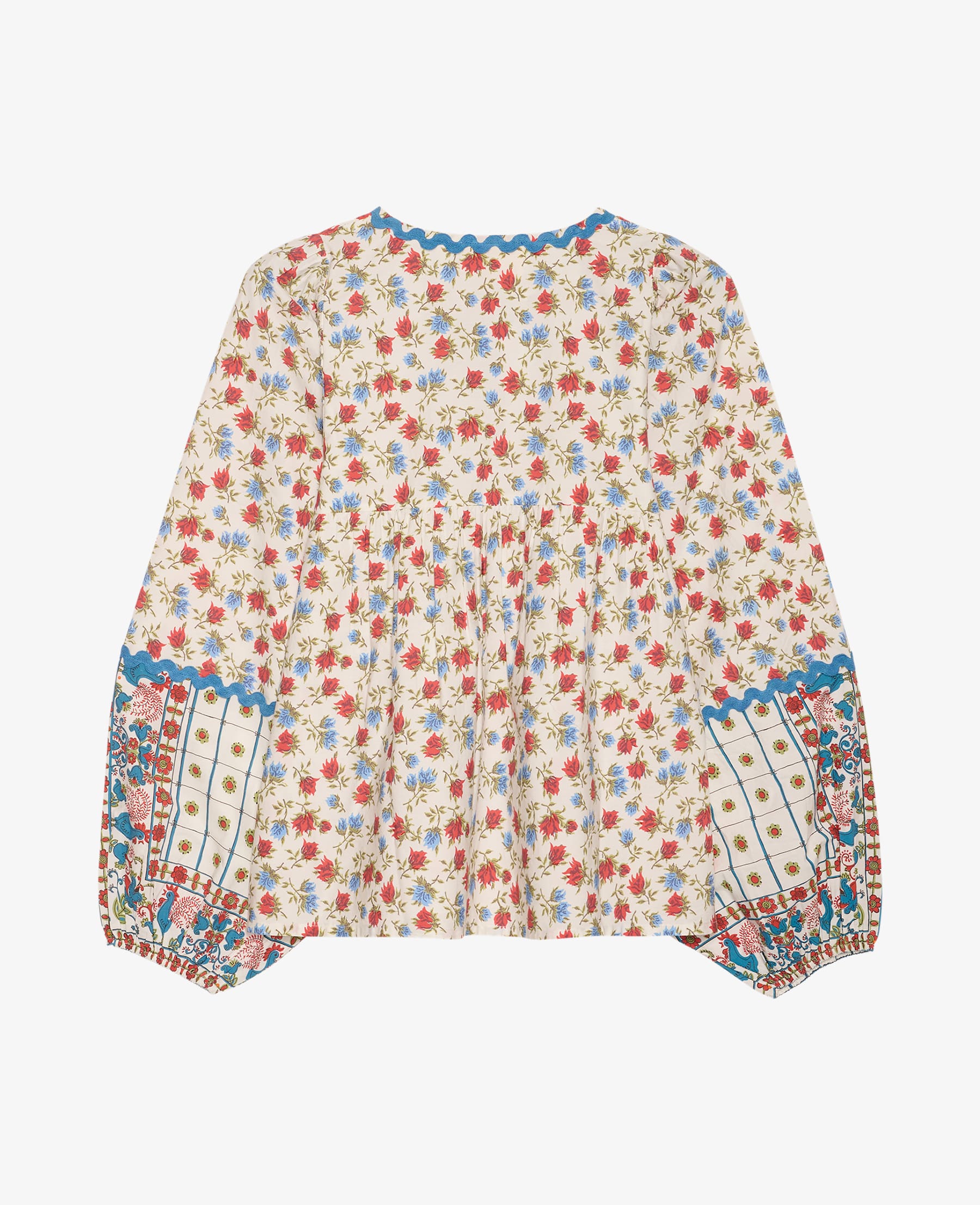 Det smukke print er inspireret af vintage servietter og kombineres med markante zigzag-bånd langs ærmerne og halsudskæringen, som skaber en iøjnefaldende og kunstnerisk kontrast. Coral Top er en karakterfuld skjorte, der emmer af Sissel Edelbos unikke univers og håndværksmæssige detaljer – let at style med både jeans, nederdele og løse bukser.