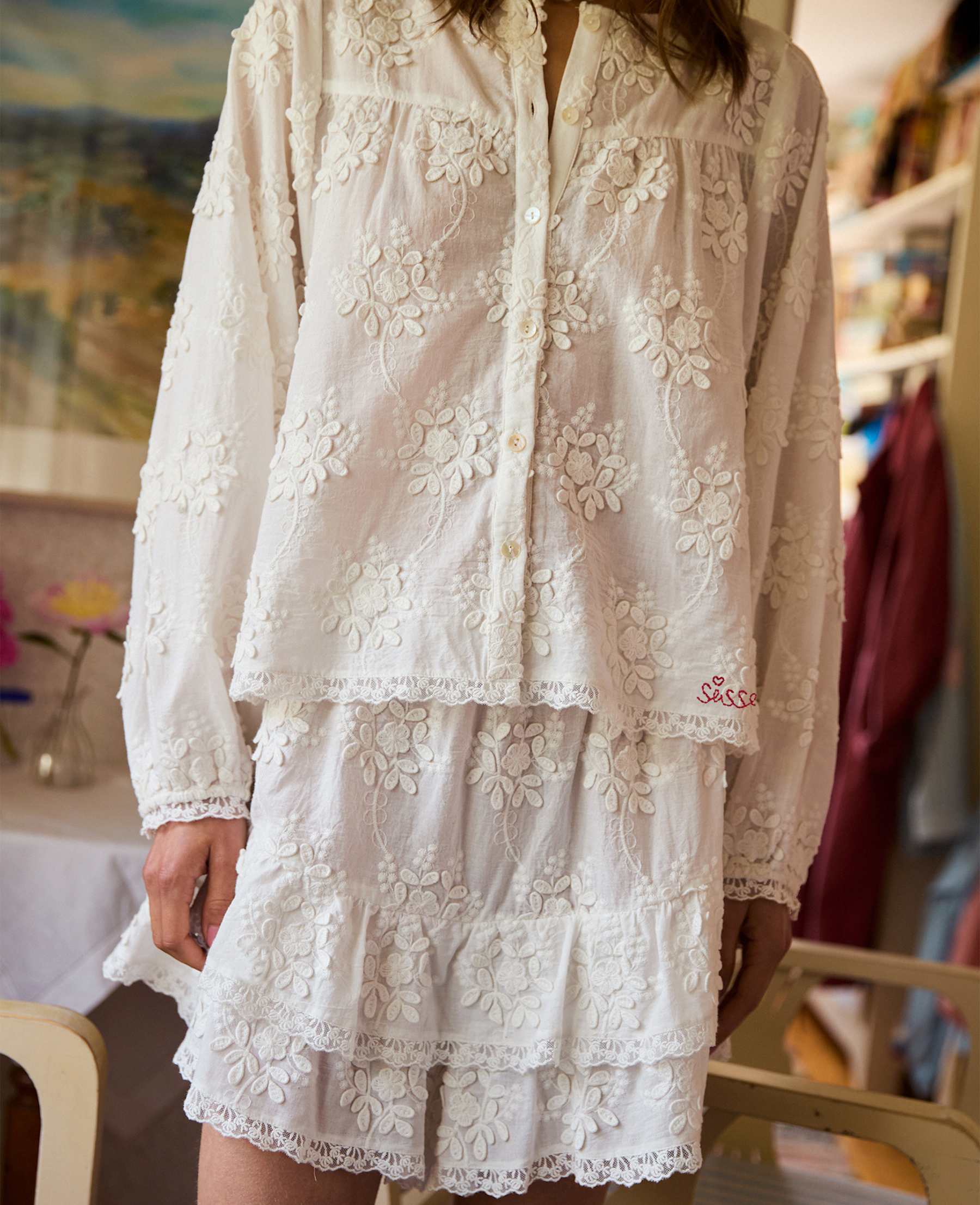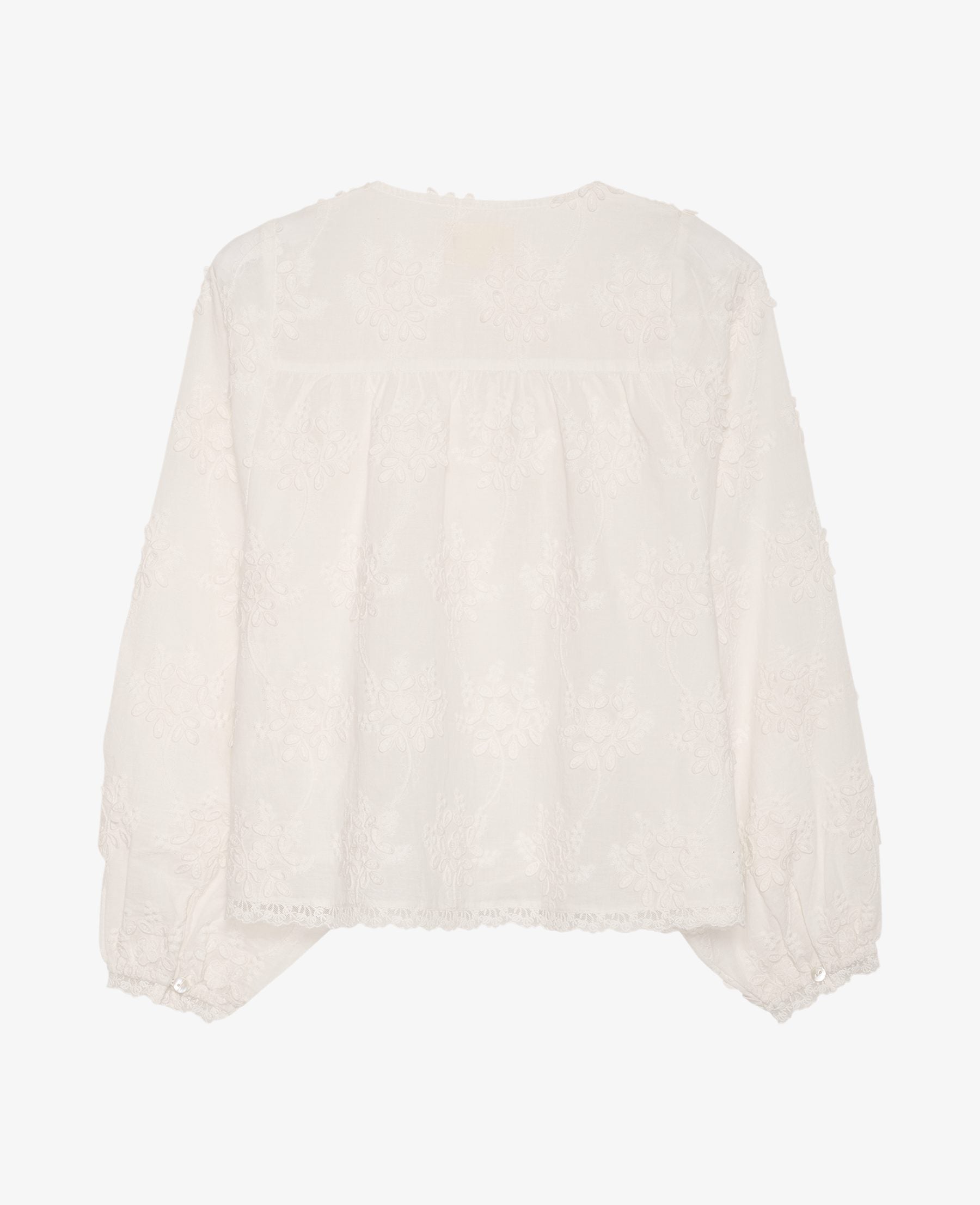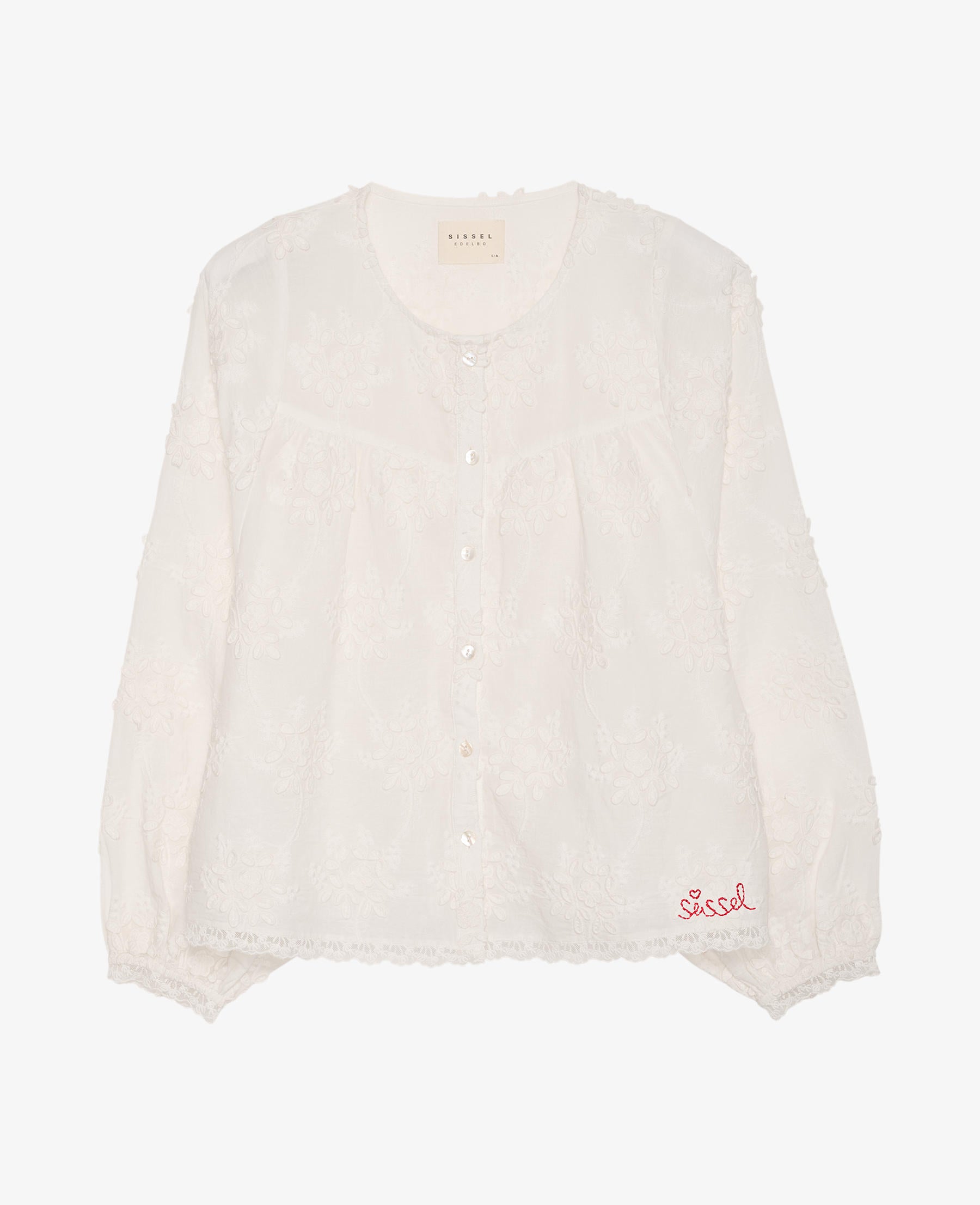 En smuk hvid bluse med fine blomsterdetaljer, der kombinerer romantik, lethed og Sissel Edelbos karakteristiske håndværksinspirerede stil – perfekt til både hverdag og særlige anledninger.