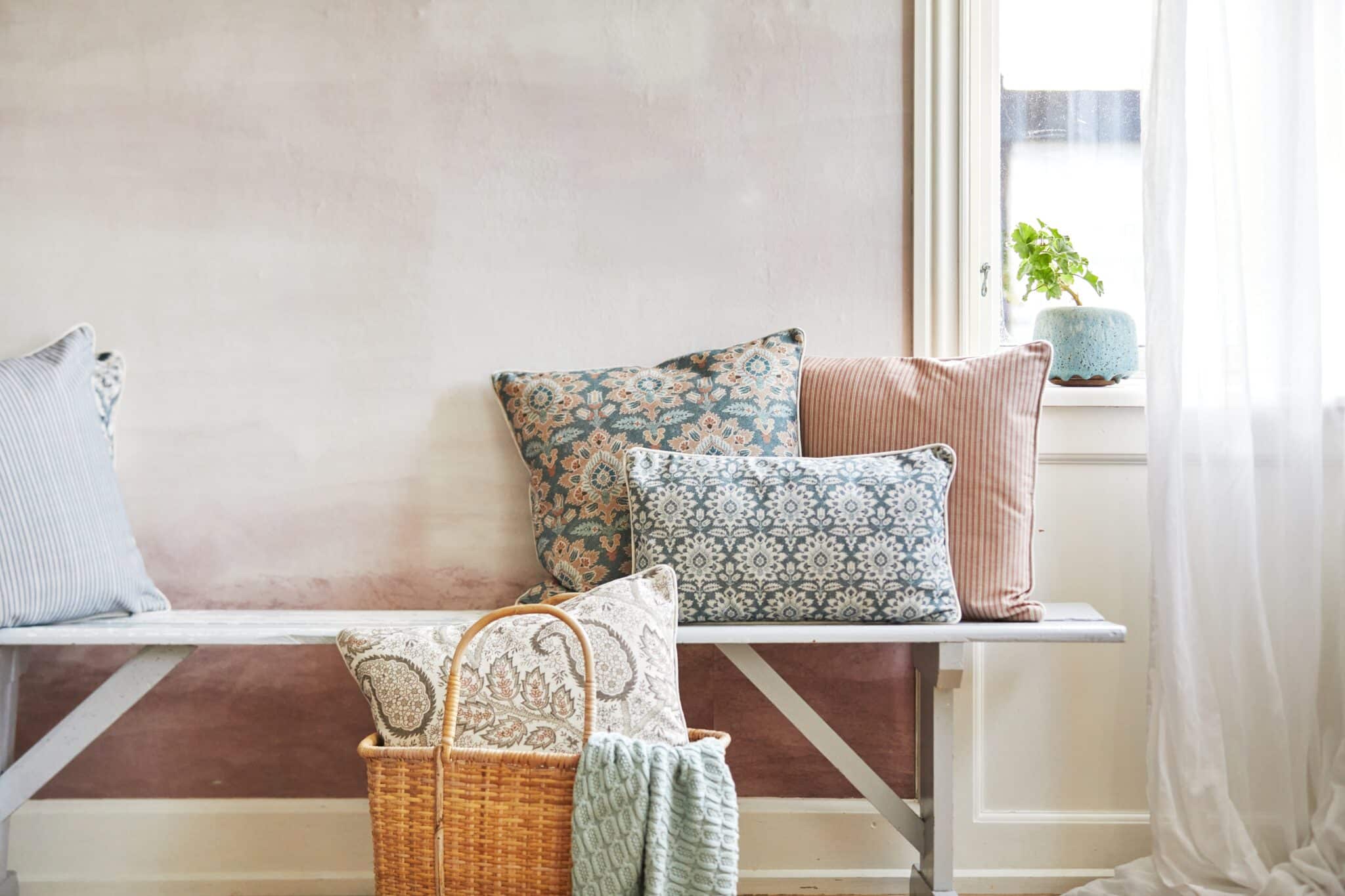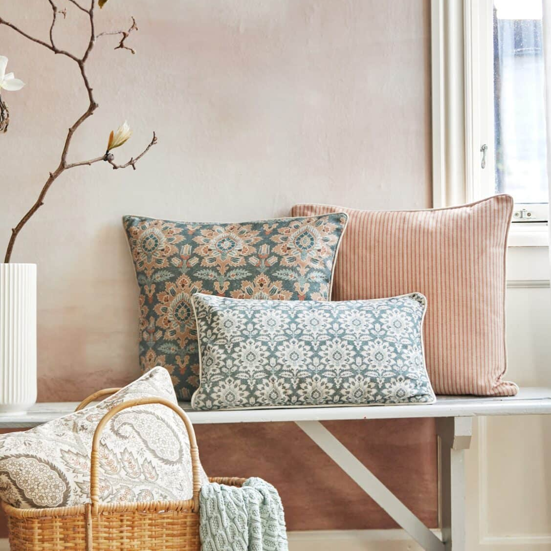 Denne pude forener klassisk blomsteræstetik med afdæmpede nuancer af støvet blå, sand og turkis. Det symmetriske mønster skaber et harmonisk og raffineret udtryk, mens de afrundede hjørner og den smalle kant (piping) fuldender designet med et elegant og gennemført finish.