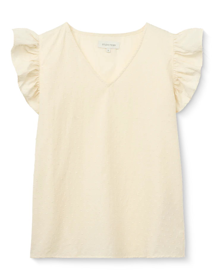 En feminin top med flæseærmer, der falder smukt, og en blød V-udskæring.