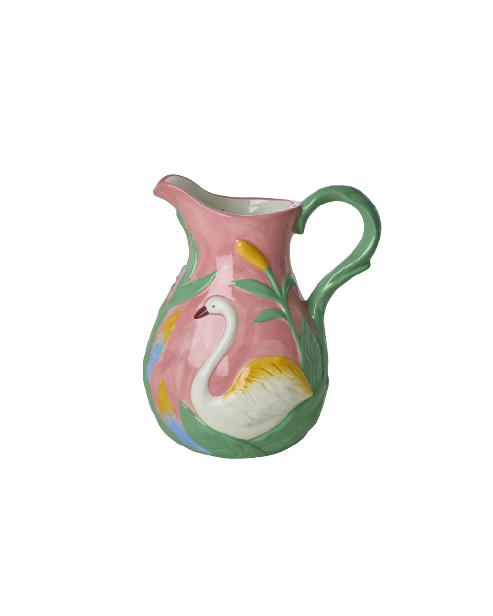 Skøn og finurlig kande i en sød lyserød og grøn farve. Kanden er lavet af keramik og er pyntet med en flot svane. Den kan rumme op til 1,4L og er god til næsten alt; som vandkande til middagen, juice til brunchen eller vin til aftensmaden. Du kan også købe en buket af dine yndlingsblomster og bruge kanden som en vase!