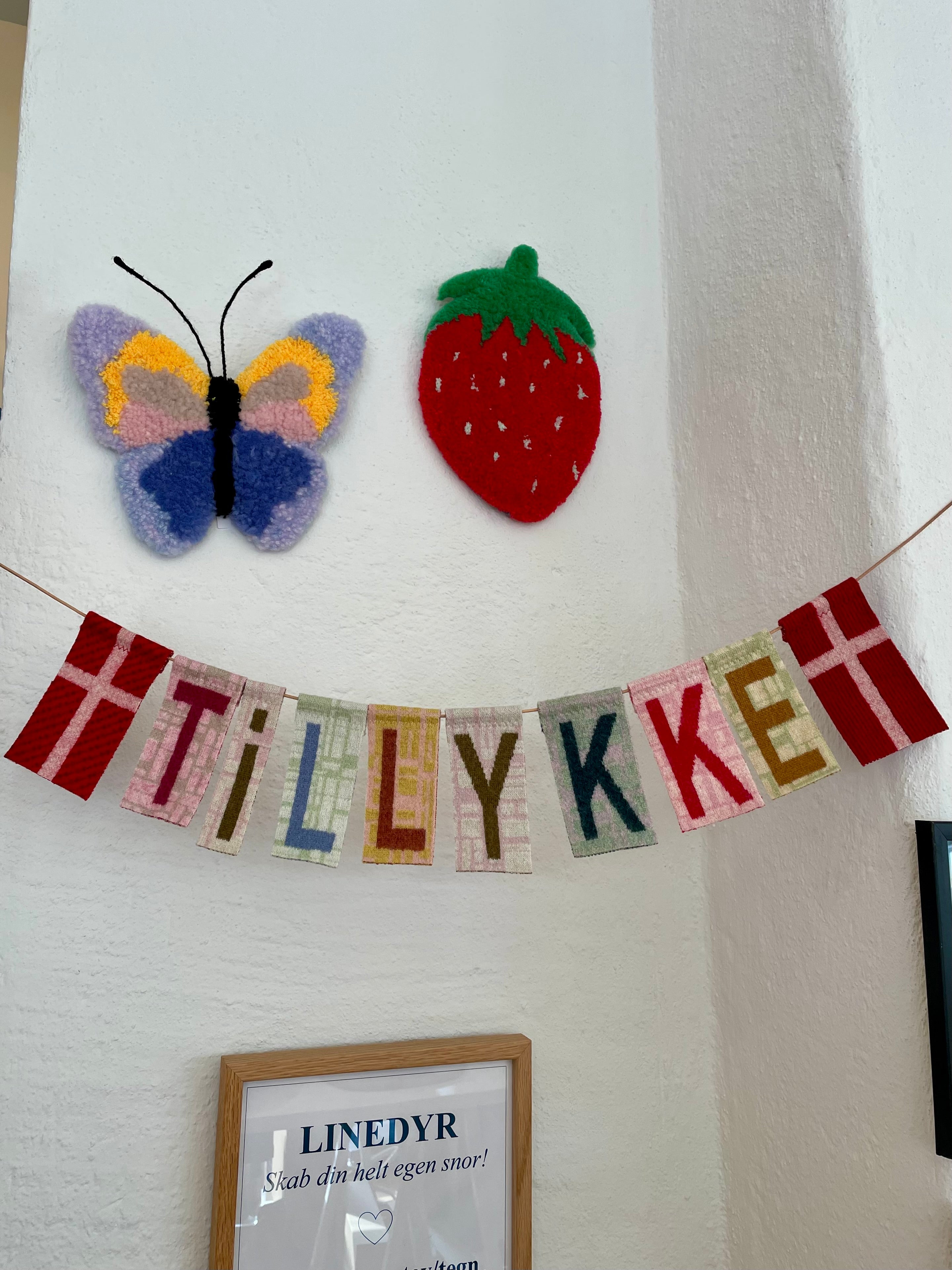 Bogstaverne er strikket i 100% blød merinould og måler ca. 12 cm i højden (bredden varierer naturligt alt efter bogstavet). Udover alfabetet kan du også vælge søde symboler som dansk flag, blomst, hjerte eller stjerne – perfekt som en ekstra detalje i et navn eller en guirlande.