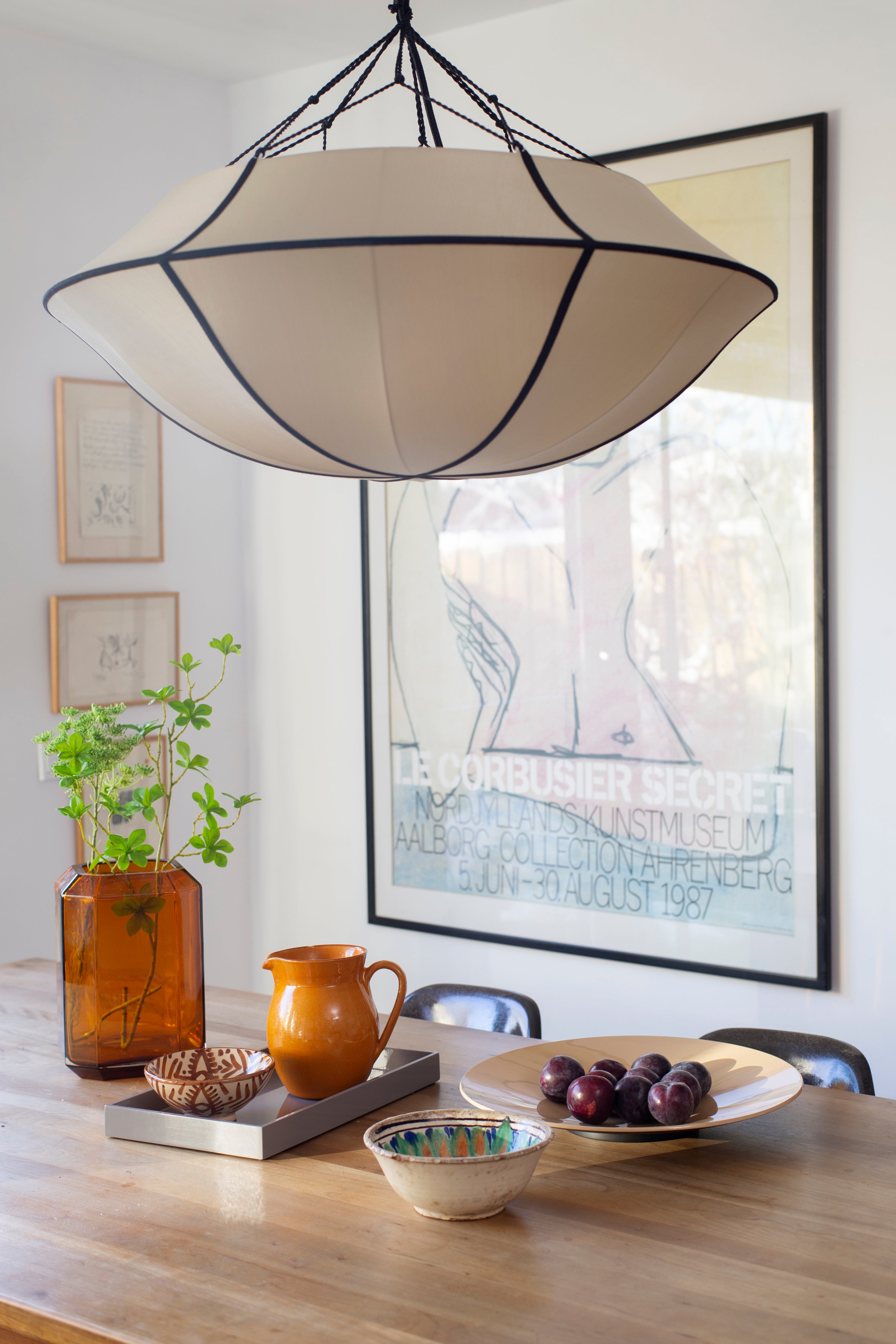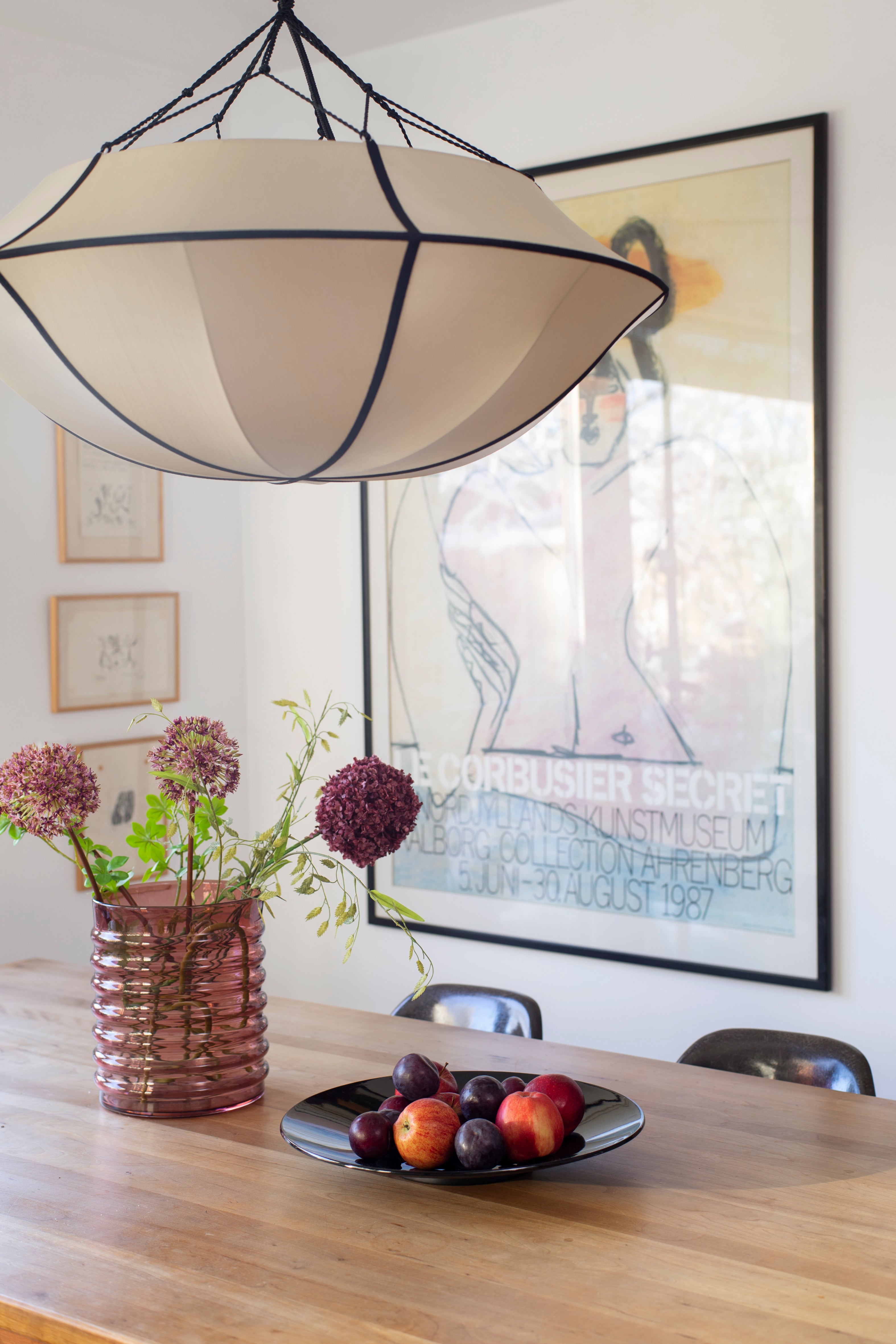 Lampeskærmen hænger smukt fra loftet og tilfører et roligt, sofistikeret udtryk til dit hjem – perfekt over spisebordet, i stuen eller soveværelset. Den lette silke giver et blødt og behageligt lys, som skaber varme og hygge i rummet.
