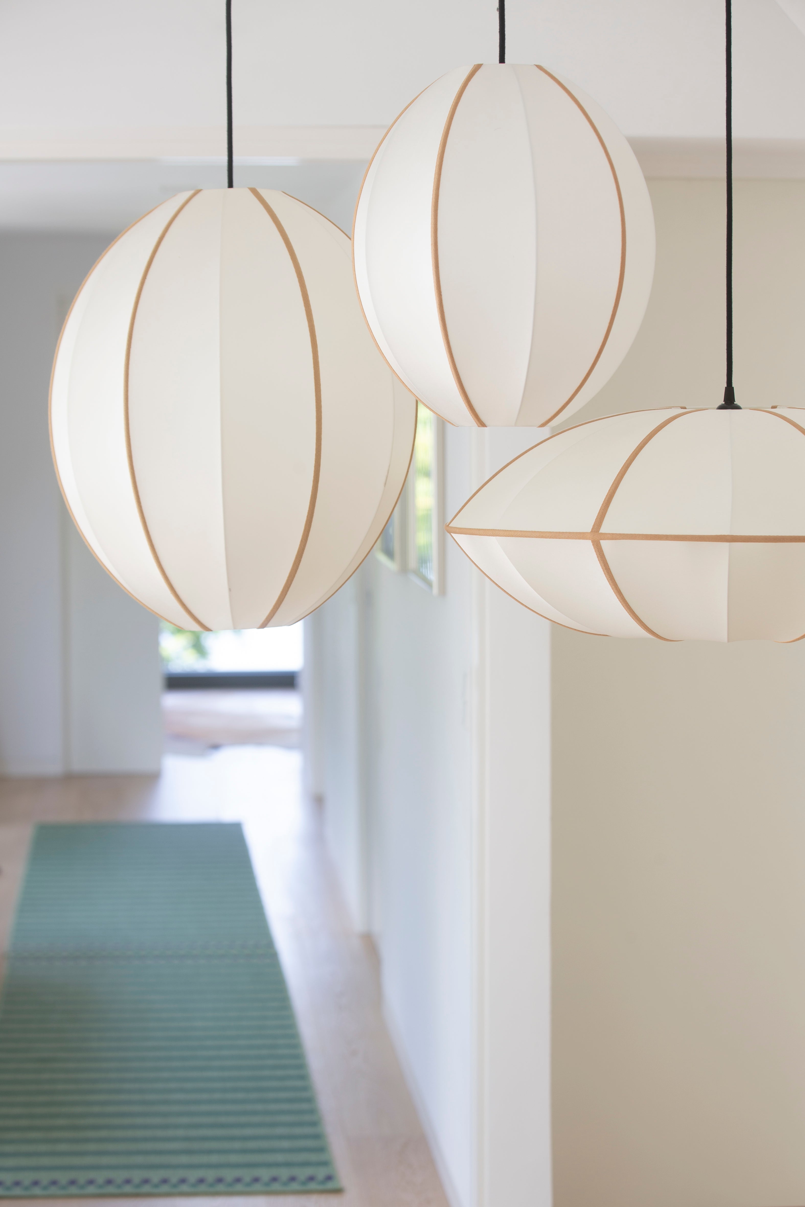 Lampeskærmen hænger smukt fra loftet og tilfører et roligt, sofistikeret udtryk til dit hjem – perfekt over spisebordet, i stuen eller soveværelset. Den lette silke giver et blødt og behageligt lys, som skaber varme og hygge i rummet.