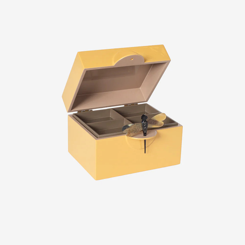 Super smukt smykkeskrin fra det Oi Soi Oi, der kombinerer elegance og funktionalitet. Hvert skrin er håndlavet og lakeret 13-15 gange for at opnå den høje kvalitet. De elegante smykkeskrin er den perfekte opbevaring til dine mest værdsatte smykker eller minder. Skrinene lukkes med en elegant og unik guldsmed lavet af bøffelhorn, der tilføjer et eksklusivt og luksuriøst præg. Den dyrebare lakæske er ikke kun praktisk, men også så stilfulde og smuk at den fortjener at stå fremme. Smykkeskrinet er ideelle til at beskytte dine smykker, billeder, minder, babys håndaftryk og samtidig give et sofistikeret touch til dit hjem. "Dragonfly" smykkeskrinnet for et luksuriøs skrin, der både er smuk og holdbar - den perfekte gave til en du holder af.