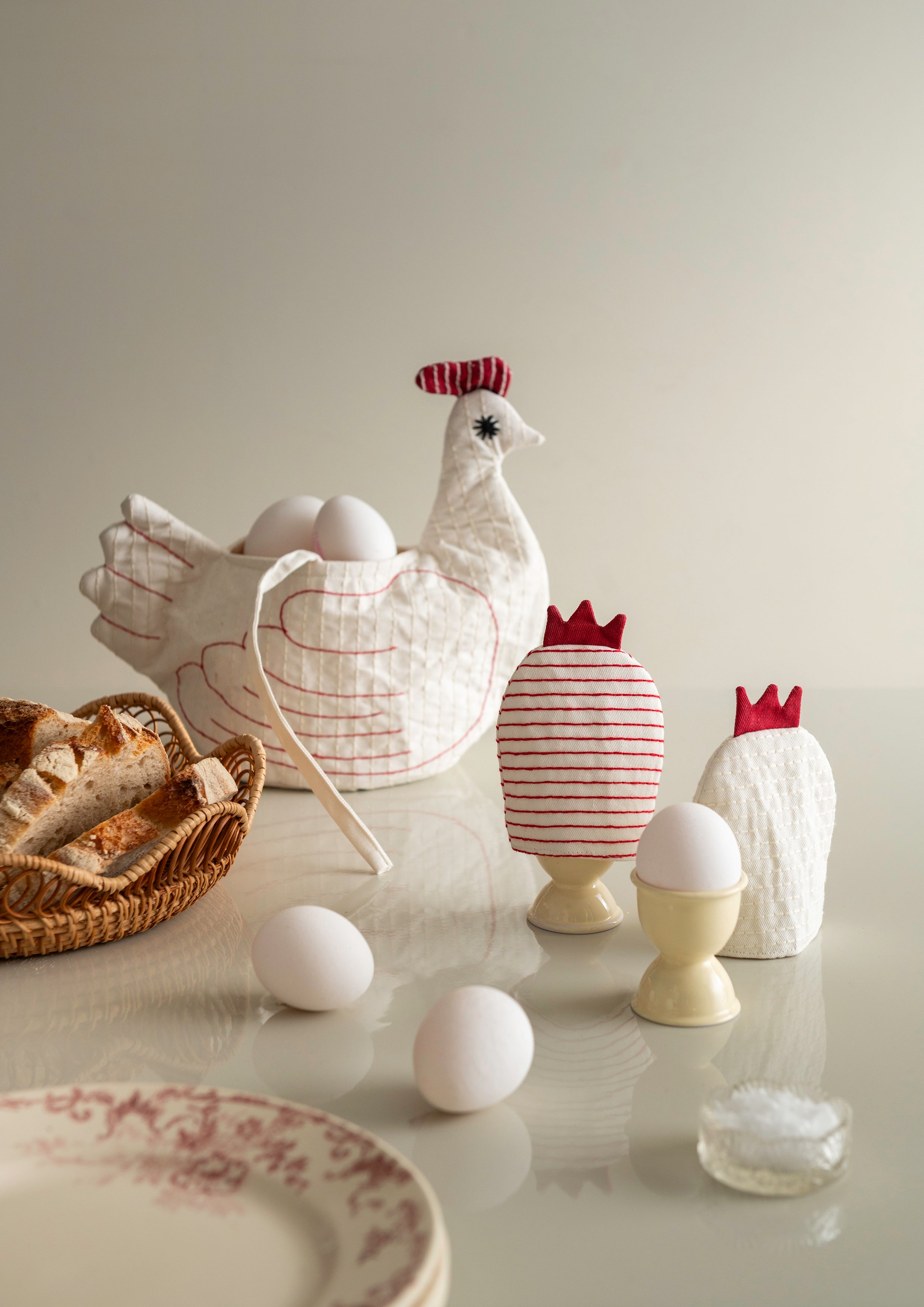 Stofhøne til at holde æggene varme eller som påskepynt.
