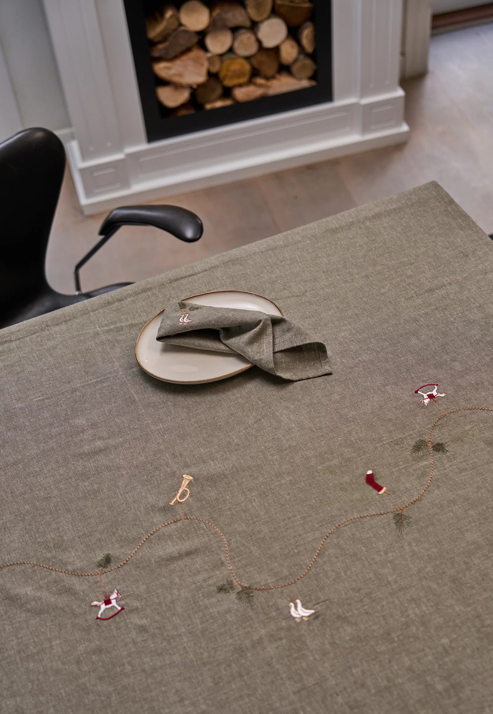 Denne smukke juledug i skaber en elegant og stilren ramme om julens borddækning. Med fine broderede julemotiver som trommer, trompet og julesokker tilfører dugen en charmerende og nostalgisk atmosfære til julebordet.