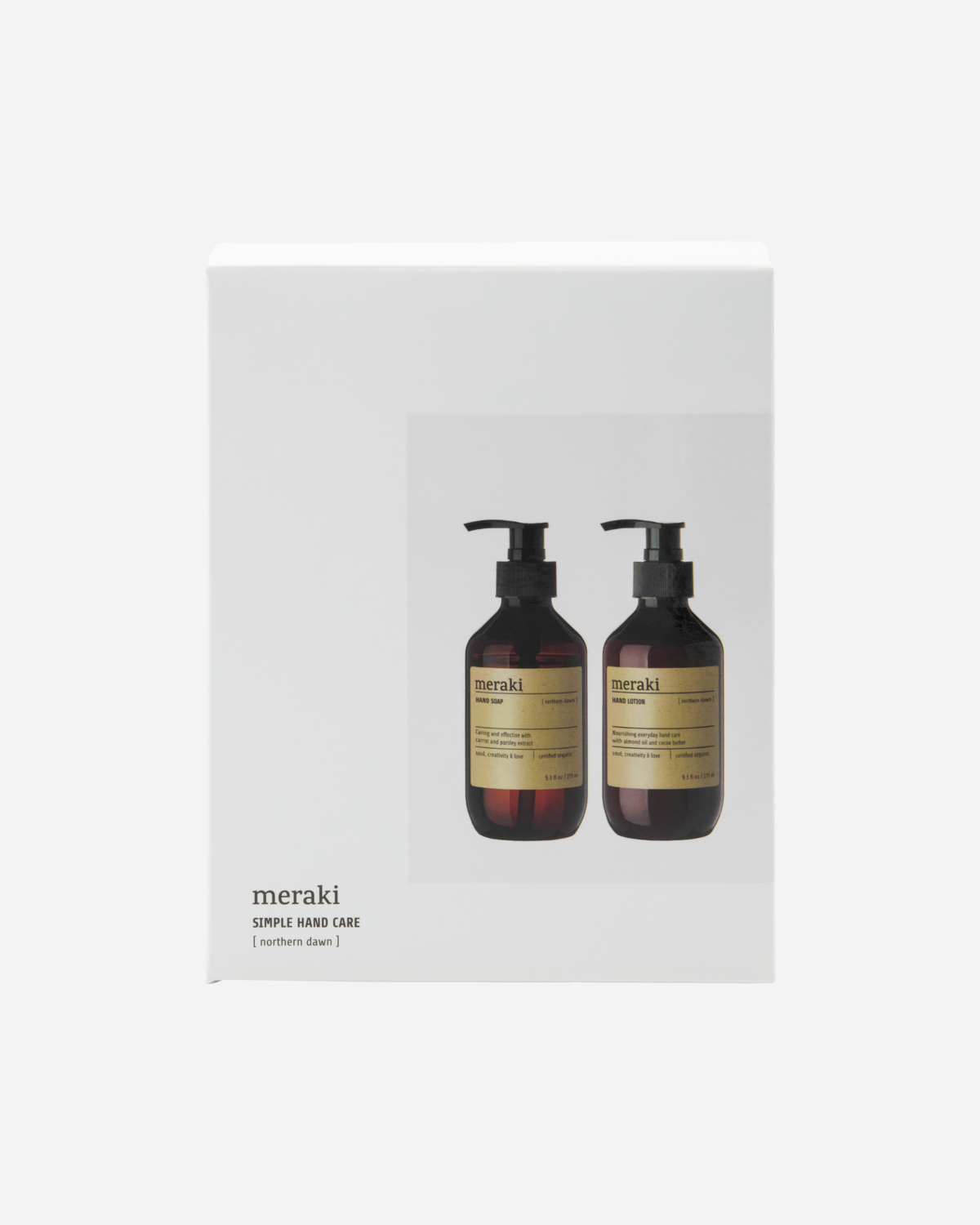 • Der findes ikke noget bedre end at forære en gave til en, man holder af. Denne gaveæske fra Meraki er lækker hudpleje til hænderne med en håndsæbe og en håndlotion. Begge er certificeret økologiske og kommer med duften Northern Dawn med forfriskende noter af appelsin, cedertræ og sød balsamico. Sæben indeholder ekstrakter fra gulerod og persille, mens lotionen plejer dine hænder med mandelolie og kakaosmør. Certificeret COSMOS økologisk af Ecocertificeret.