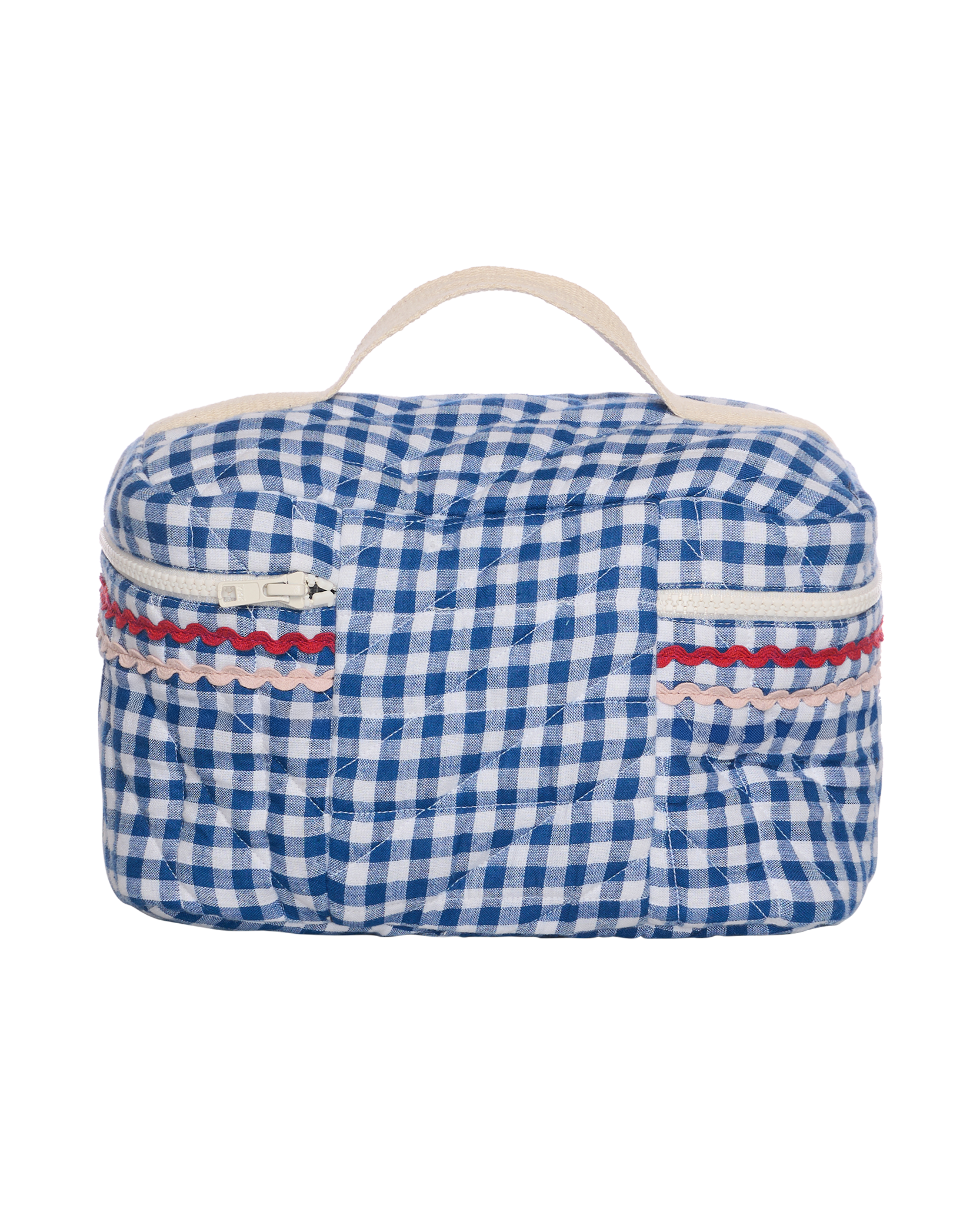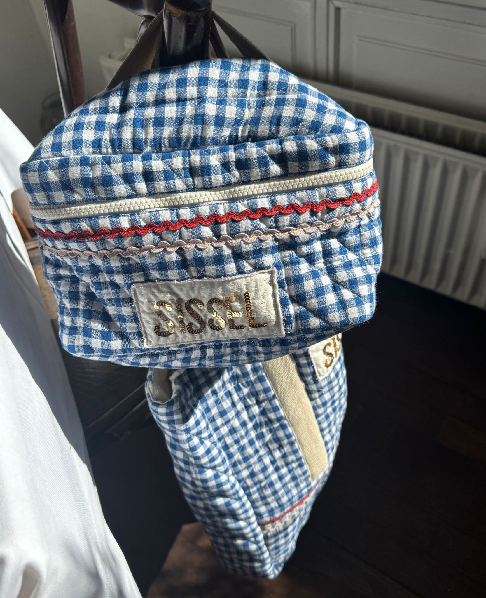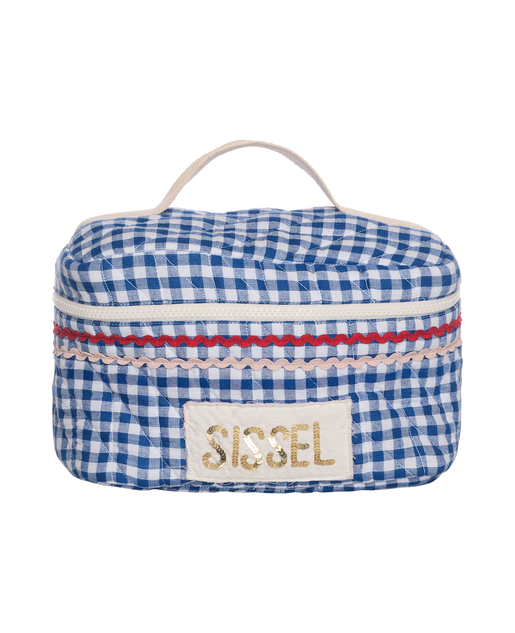 Sissel Bucket Bag har en blød, firkantet form, der gør den meget rummelig til alle småting. Tasken har en plastiklynlås som lukning og et håndtag øverst. Den har en lille lomme samlet med elastik og er fuldt foret indvendigt. Tasken er let polstret og quiltet sammen med foret, og den er lavet i 100% økologisk bomuld i garnfarvede tern. Fedt zigzag-bånd og Sissel-signaturen, lavet med glitrende pailletter, dekorerer tasken delikat.