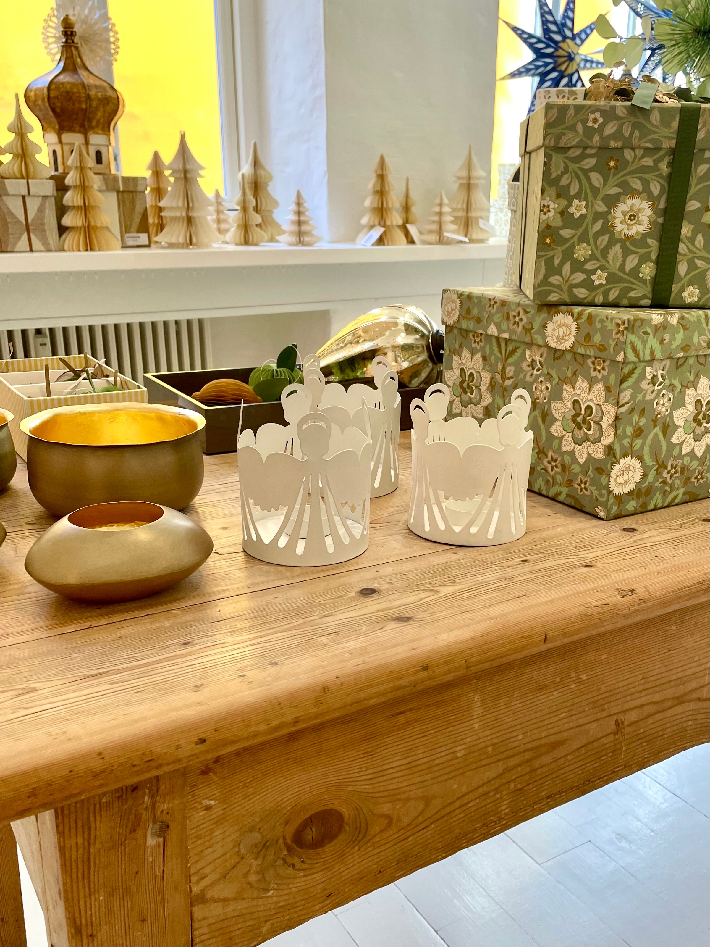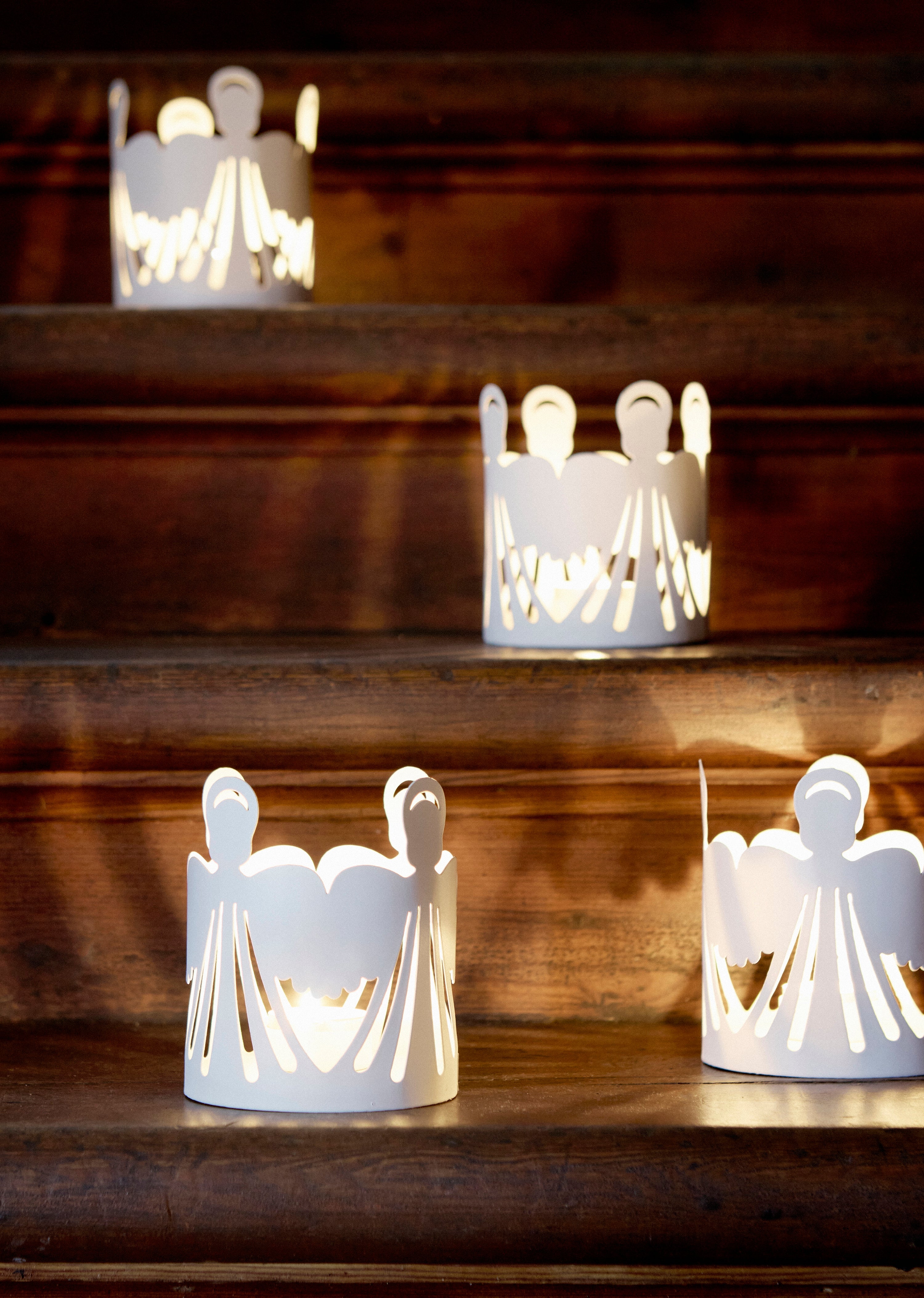 Elegant fyrfadsstage med hvidt englemotiv. Denne smukke lysestage vil bringe hygge i den mørke juletid. I lysestagen passer et lille almindeligt fyrfadslys. Den er produceret af malet metal.