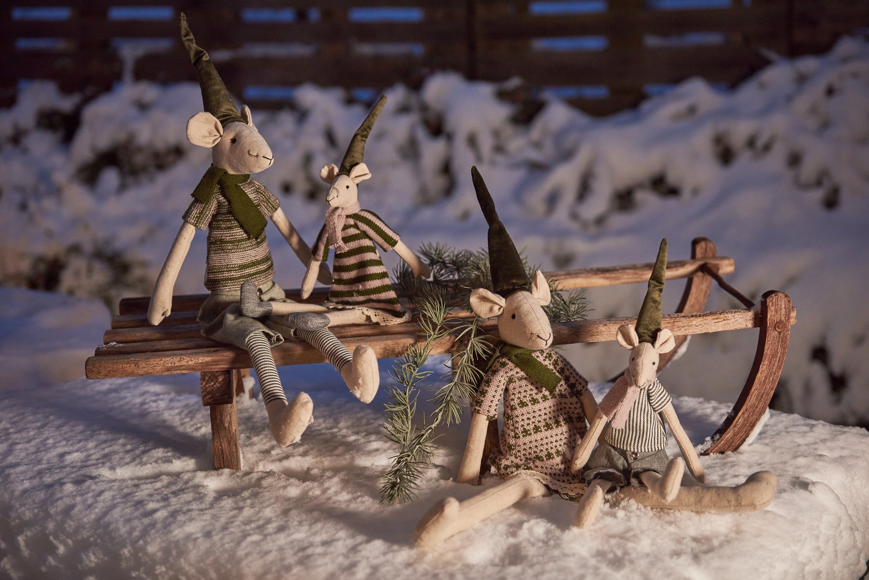 Søde store nissemus med nissehuer. Hyggeligt julepynt som spreder god stemning i julemåneden.