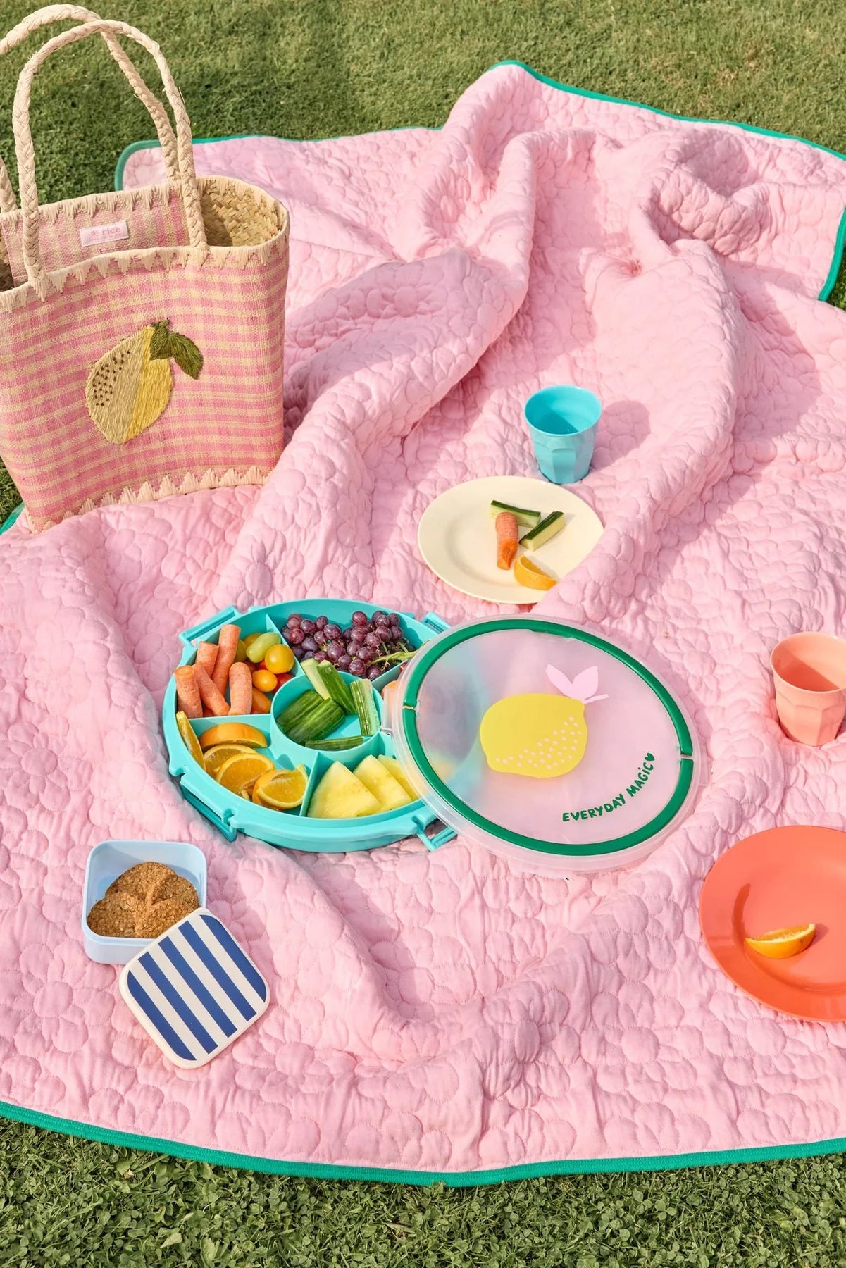 Vi elsker dette fantastiske bløde lyserøde tæppe med et quiltet blomstermønster og en grøn kant! Helt perfekt til afslapning på sofaen, til at holde varmen på en sommeraften udenfor eller som et smukt sengetæppe ... mulighederne er uendelige!