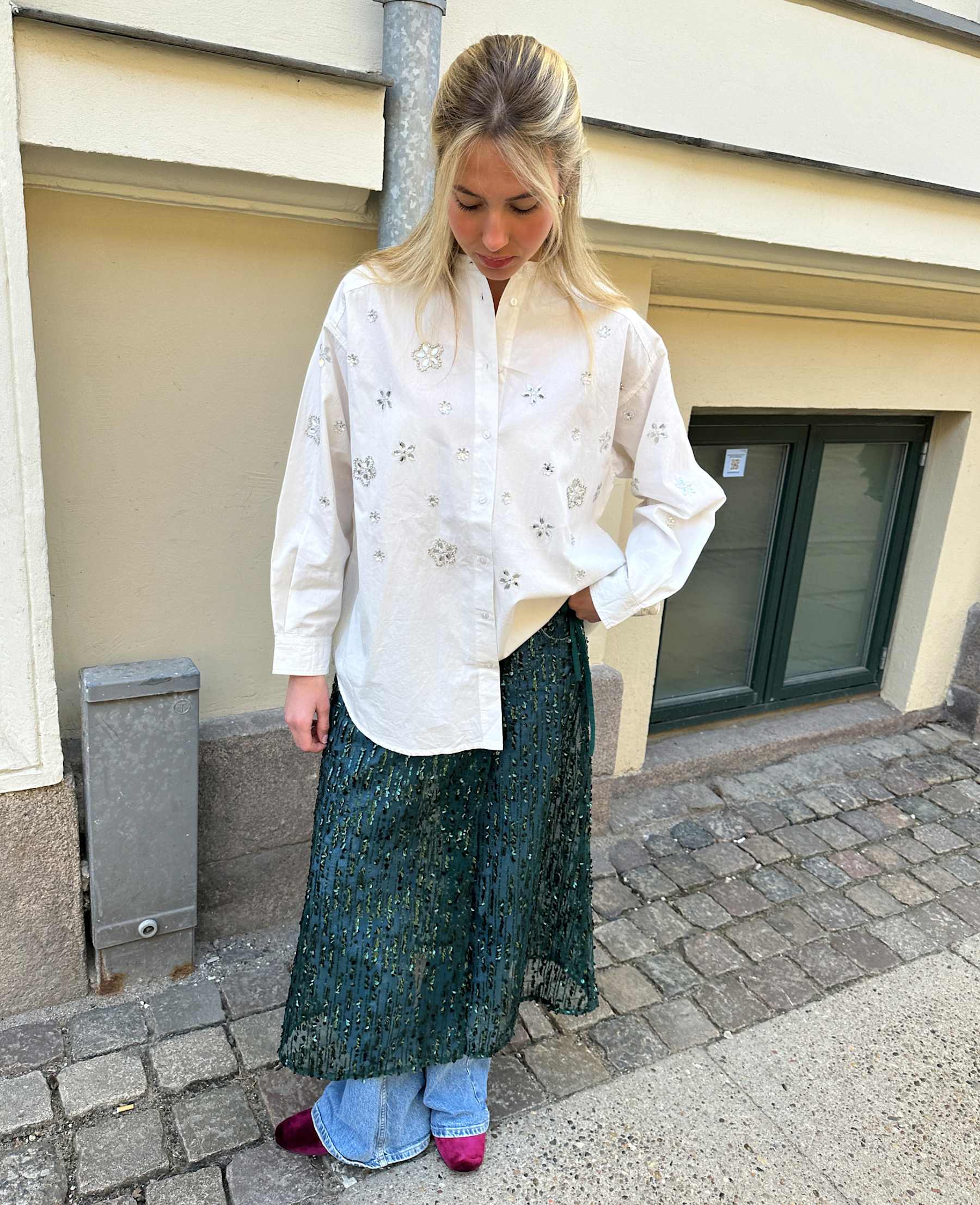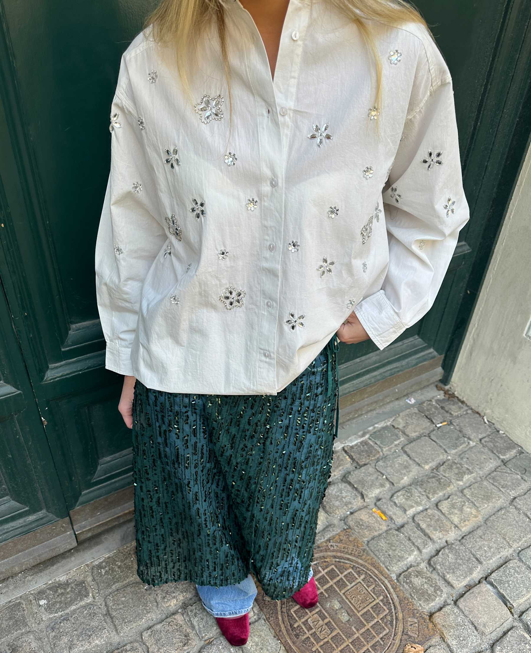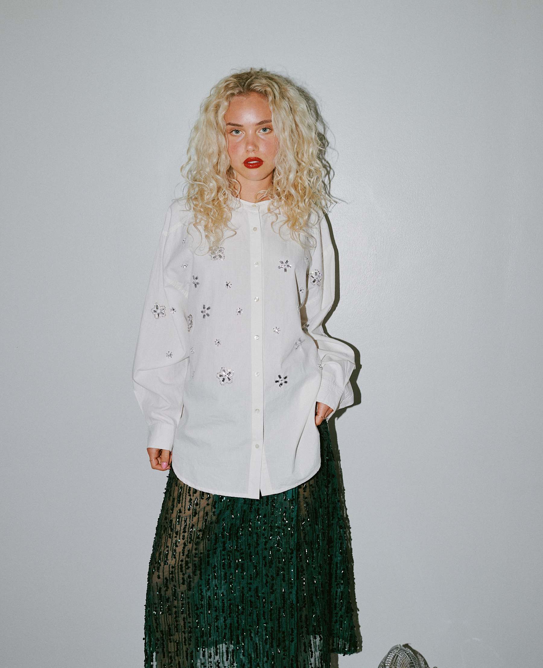 Som en elegant detalje er Terese Skjorten smukt dekoreret med rhinsten formet som fine blomstermotiver, der tilfører et strejf af glamour og gør skjorten velegnet til både hverdag og særlige anledninger.