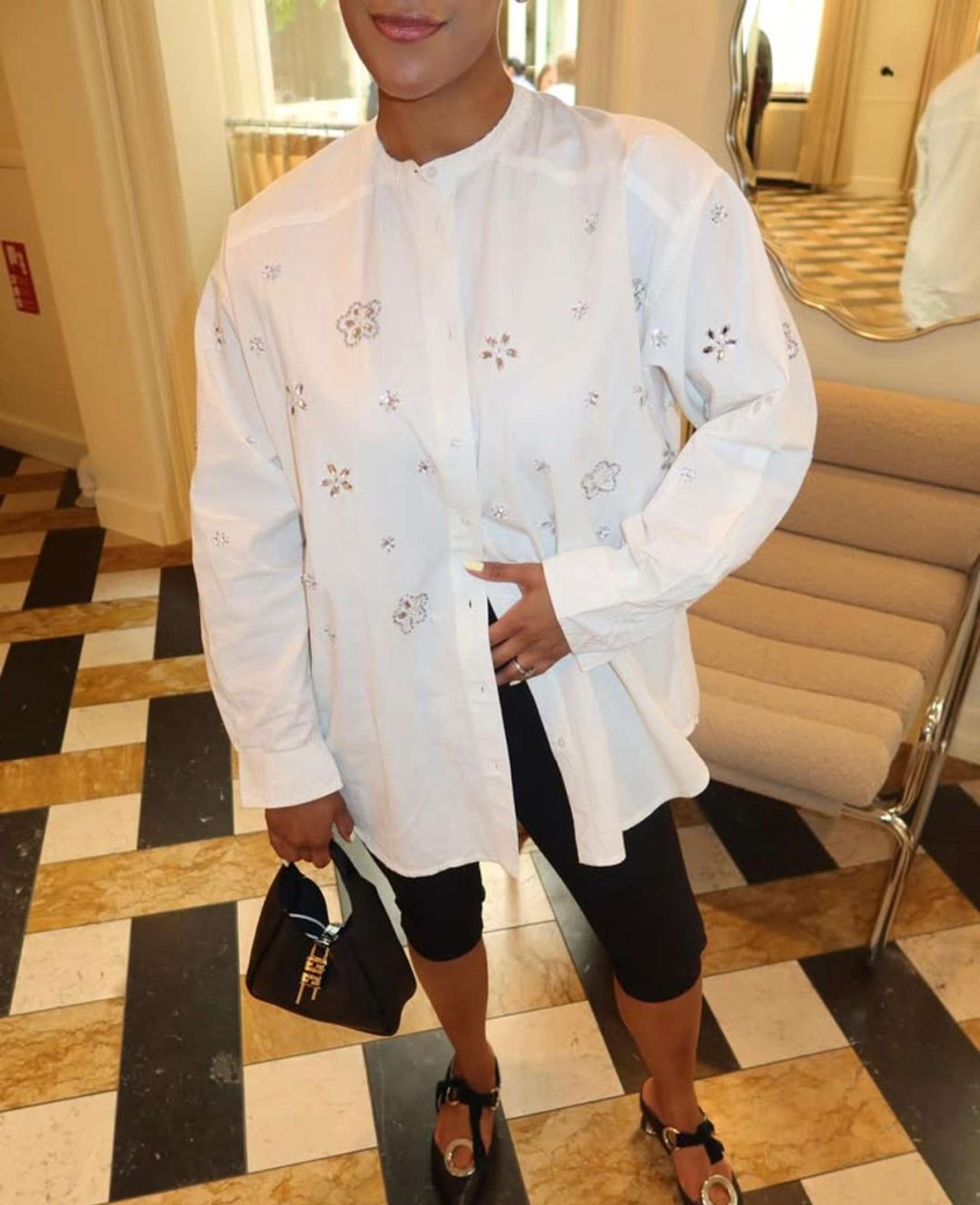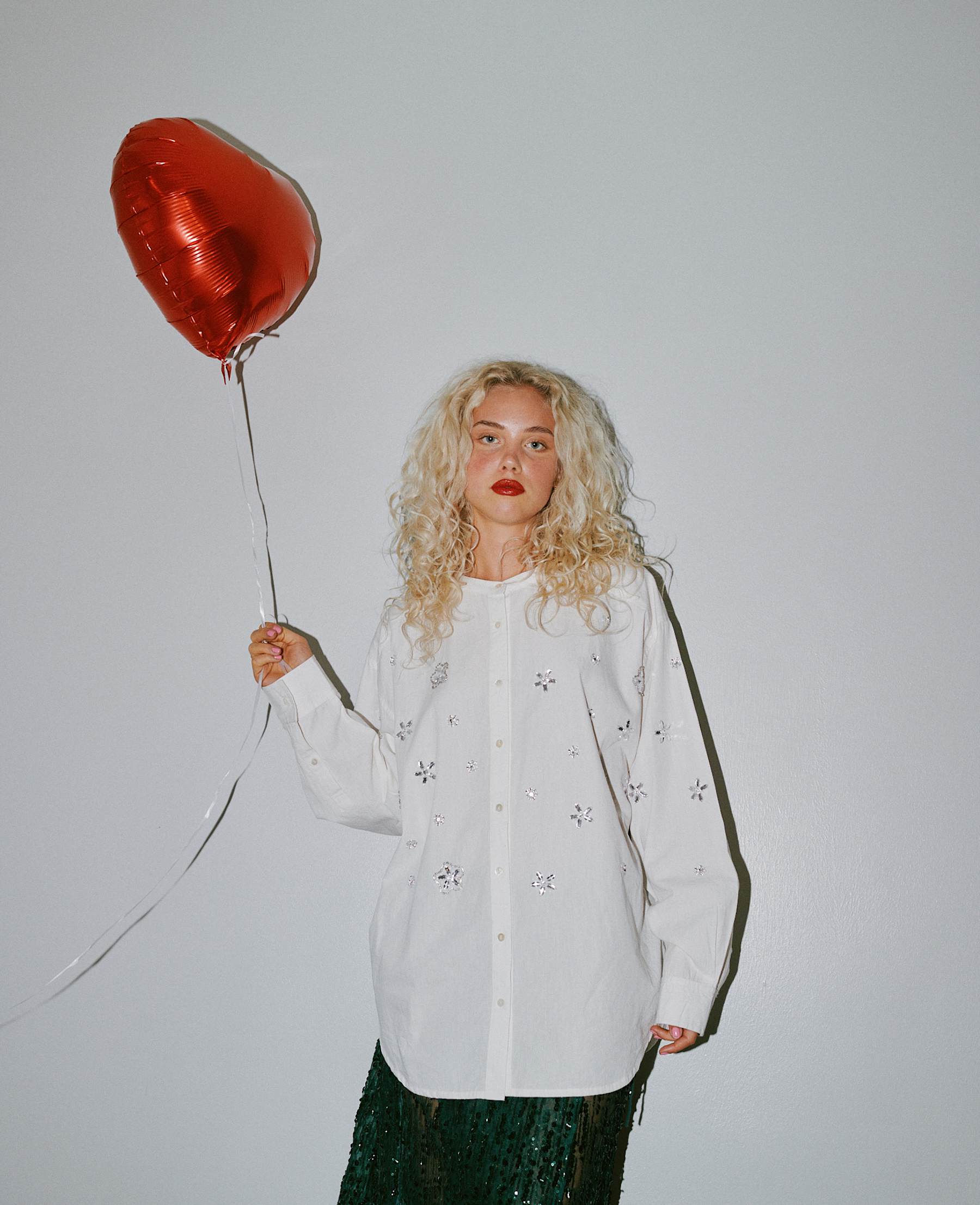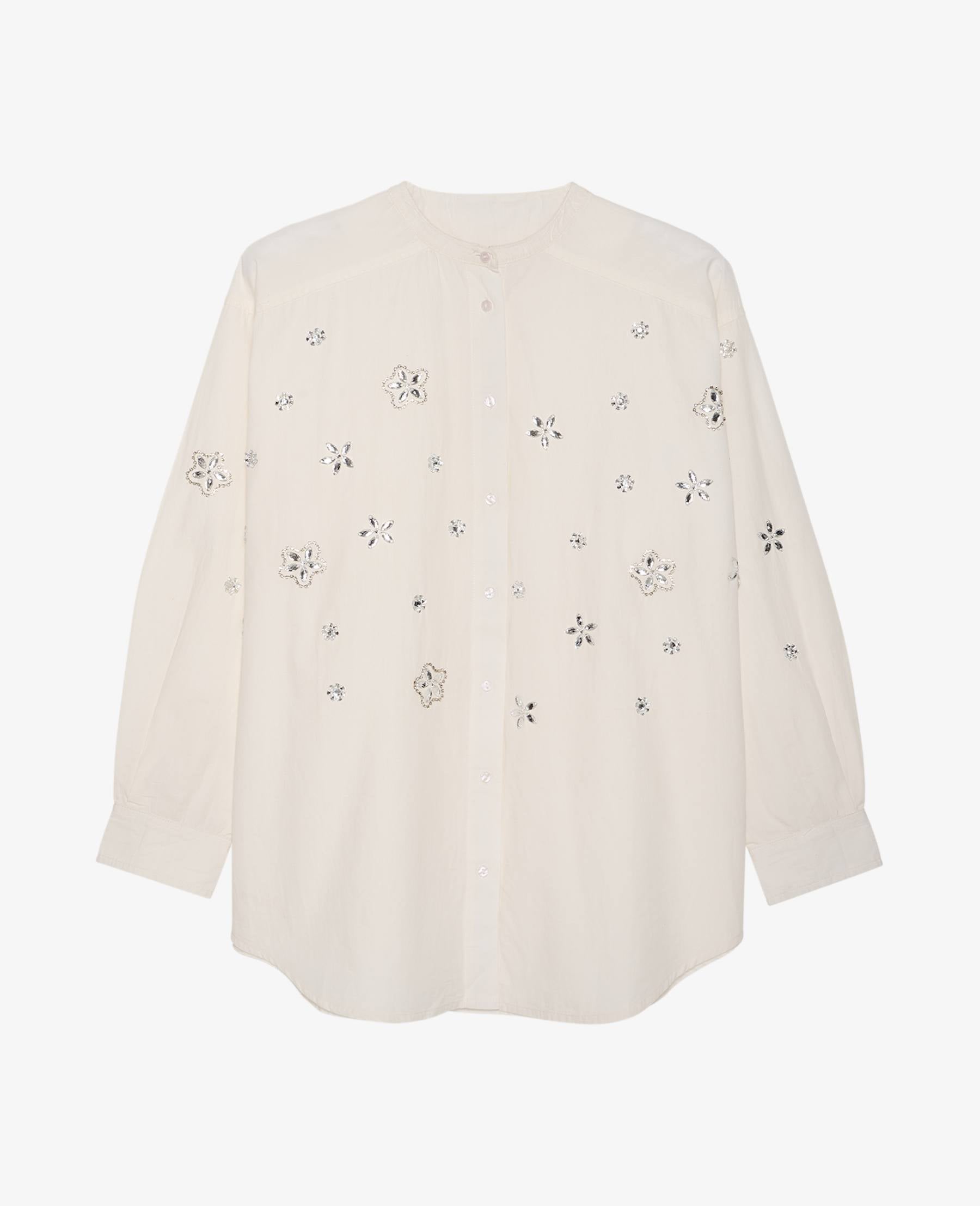 Som en elegant detalje er Terese Skjorten smukt dekoreret med rhinsten formet som fine blomstermotiver, der tilfører et strejf af glamour og gør skjorten velegnet til både hverdag og særlige anledninger.