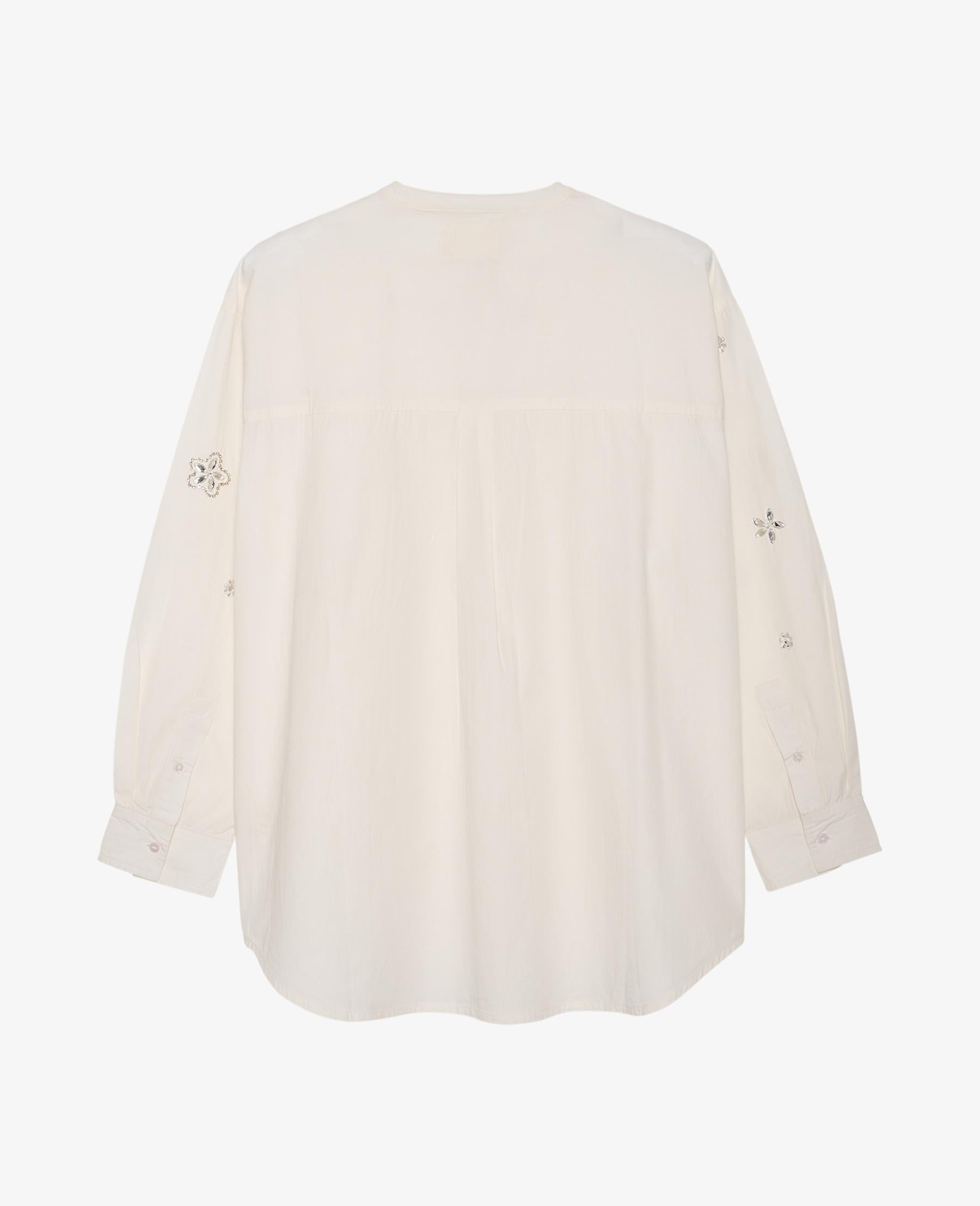 Terese Skjorte har et løst, lige snit og er fremstillet i 100% økologisk bomuld, som føles let og behagelig mod huden. Skjorten har brede, klassiske skjorteærmer samt bærestykke på ryggen med en diskret læg, der giver ekstra bevægelsesfrihed og et afslappet fald.