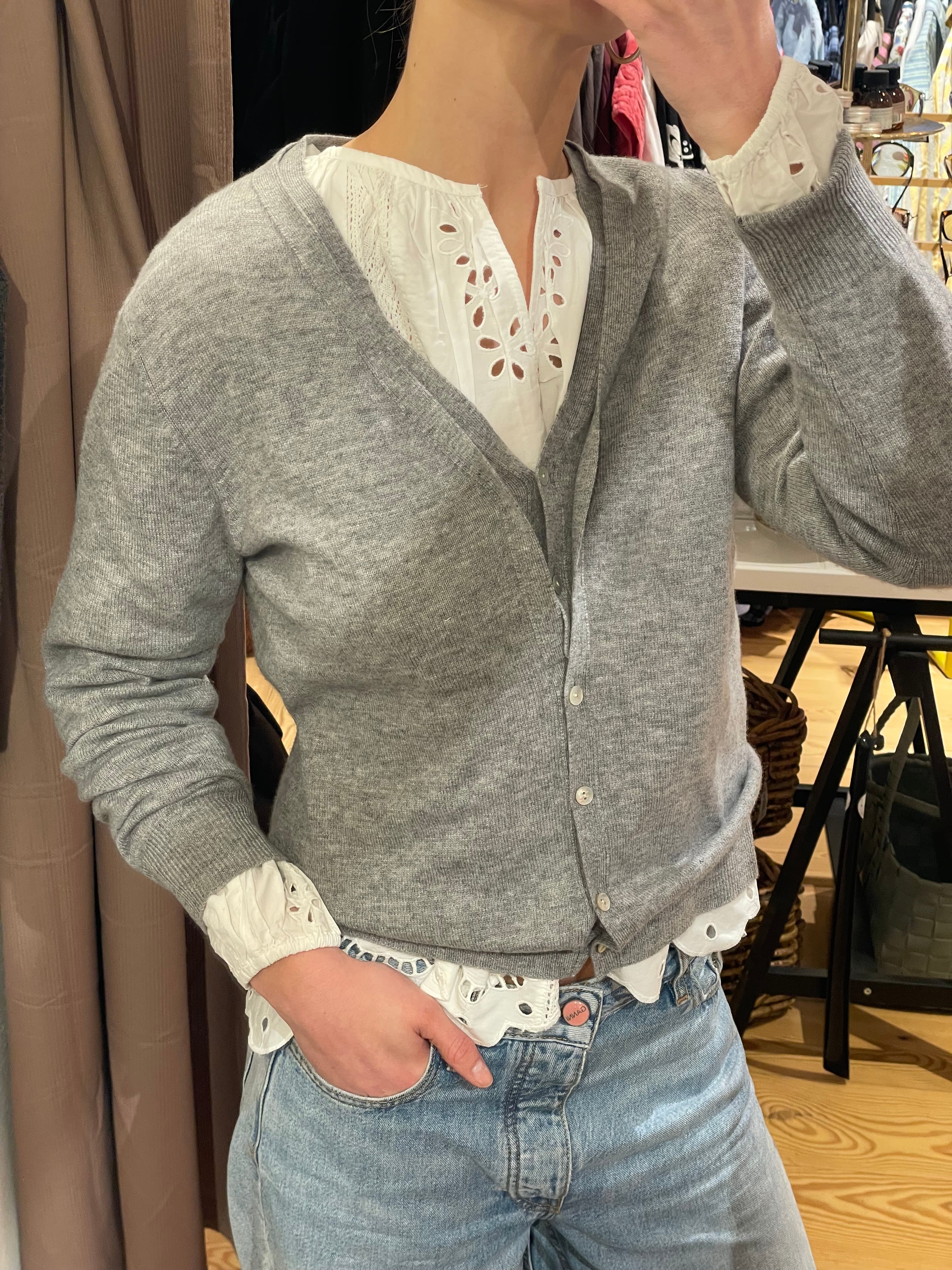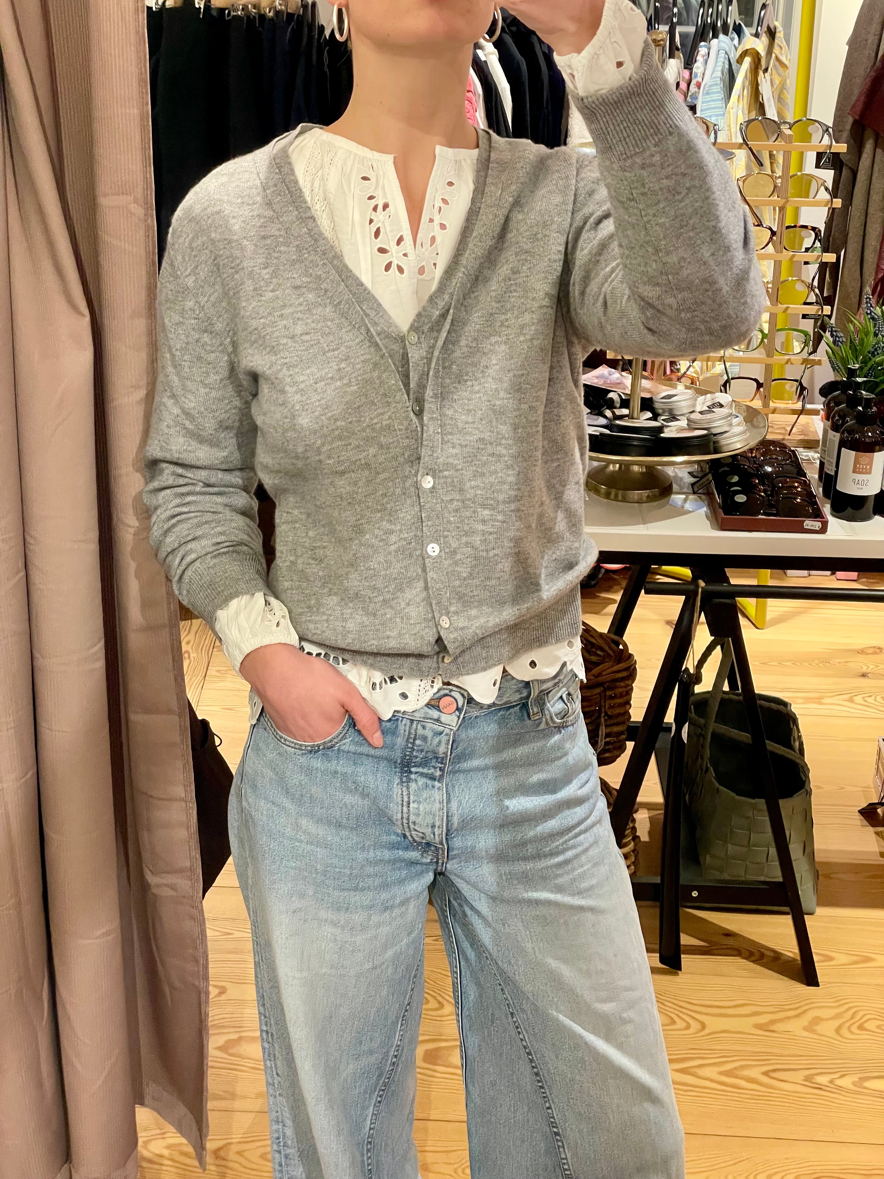 Den fine blanding af 90% merinould og 10% cashmere gør cardiganen ekstra blød, varm og komfortabel, samtidig med at den bevarer et let og luftigt fald. Perfekt til de kølige måneder.