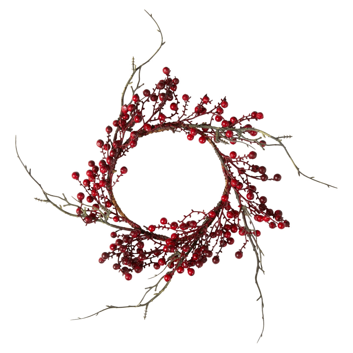 Fin rød kunstig bærkrans til at hænge eller ligge med lys i midten.