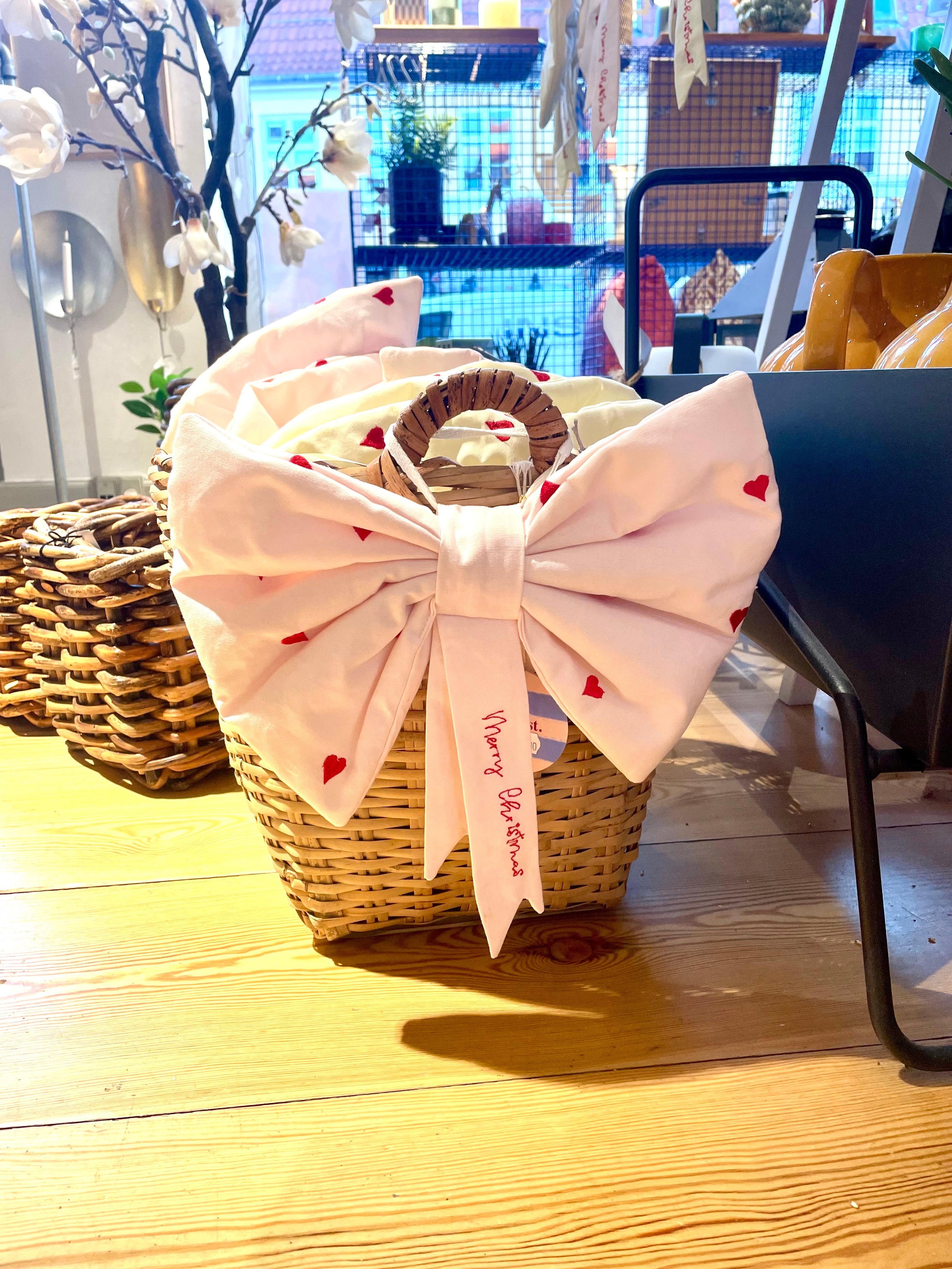 Tilføj et strejf af nostalgi til din julepynt med denne charmerende polstrede julesløjfe i farven lyserød. Sløjfen er dekoreret med broderede røde hjerter og teksten Merry Christmas, som skaber klassisk og varm julestemning i hjemmet.