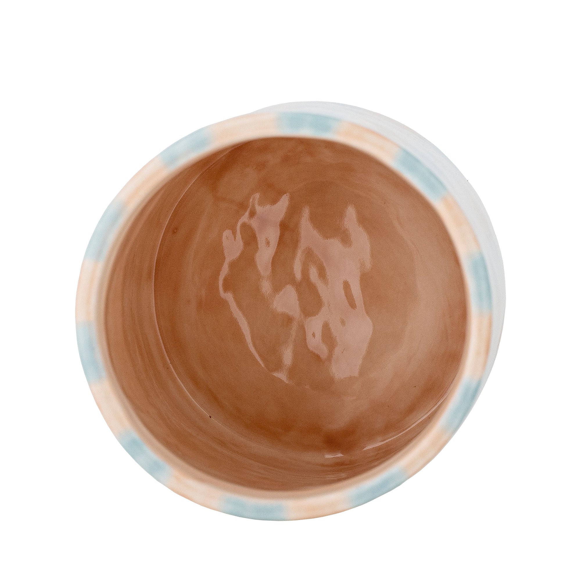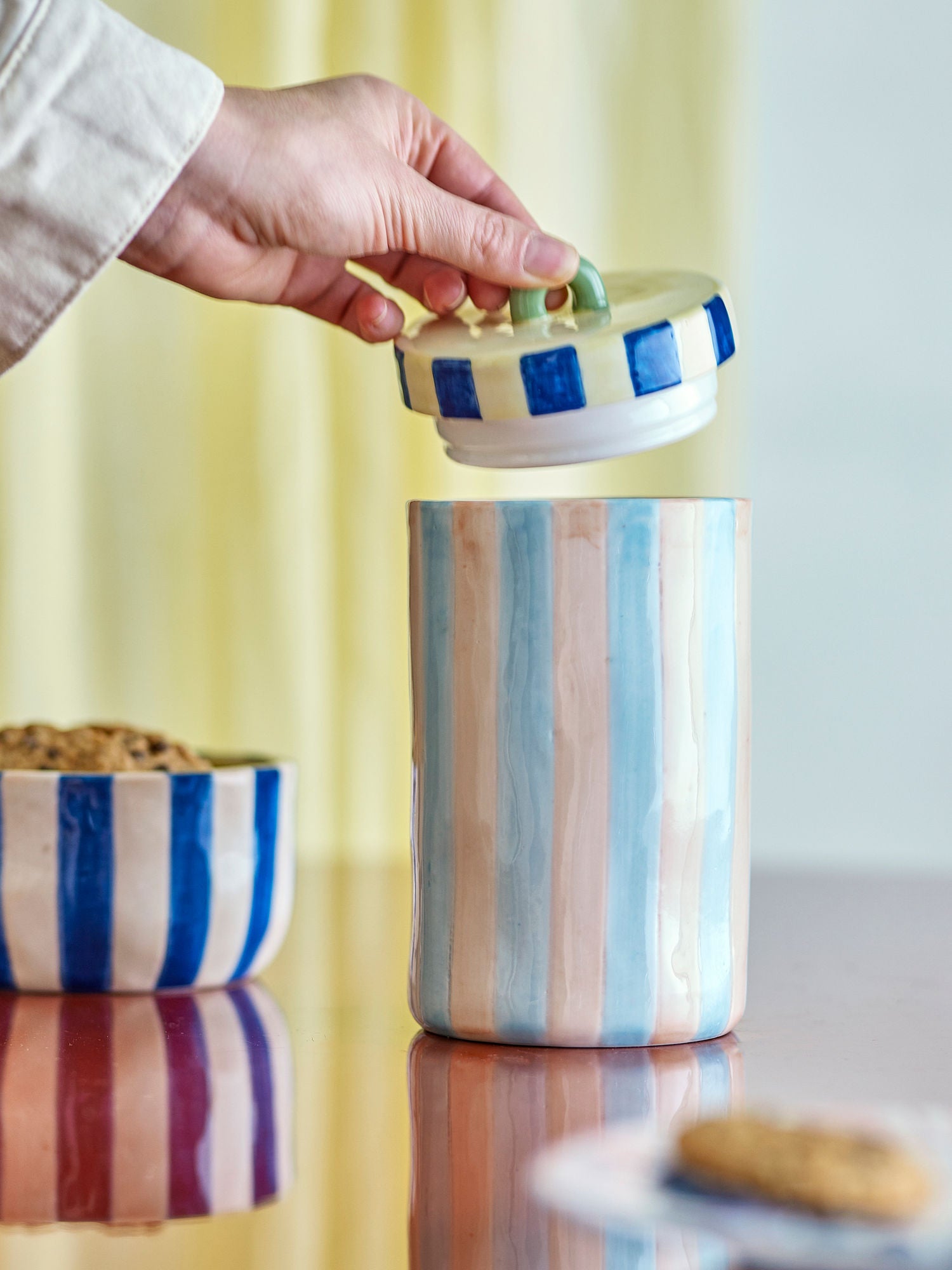 Phoenix Krukke m/låg fra Bloomingville er en krukke i stentøj med en stribet overflade og et låg i en kontrastfarve med en praktisk hank. Hver krukke er håndmalet, og der kan forekomme små forskelle i mønster og farveintensitet, hvilket gør hver enkelt unik.