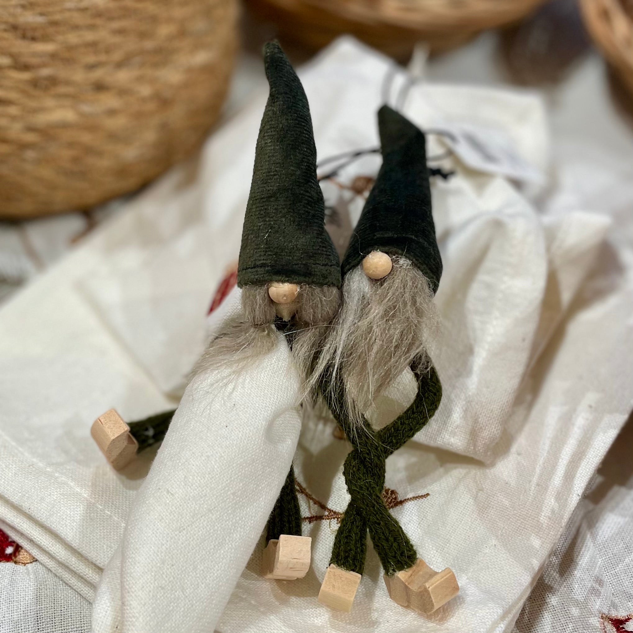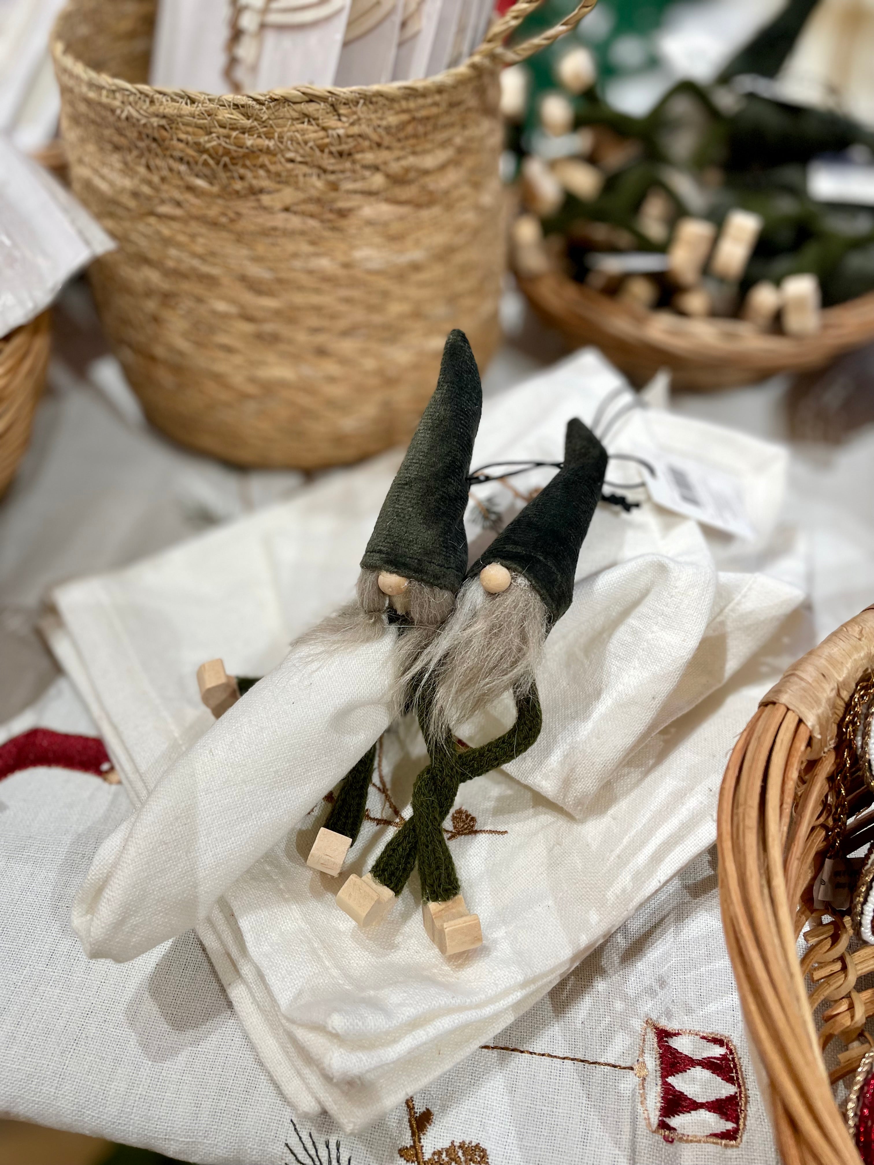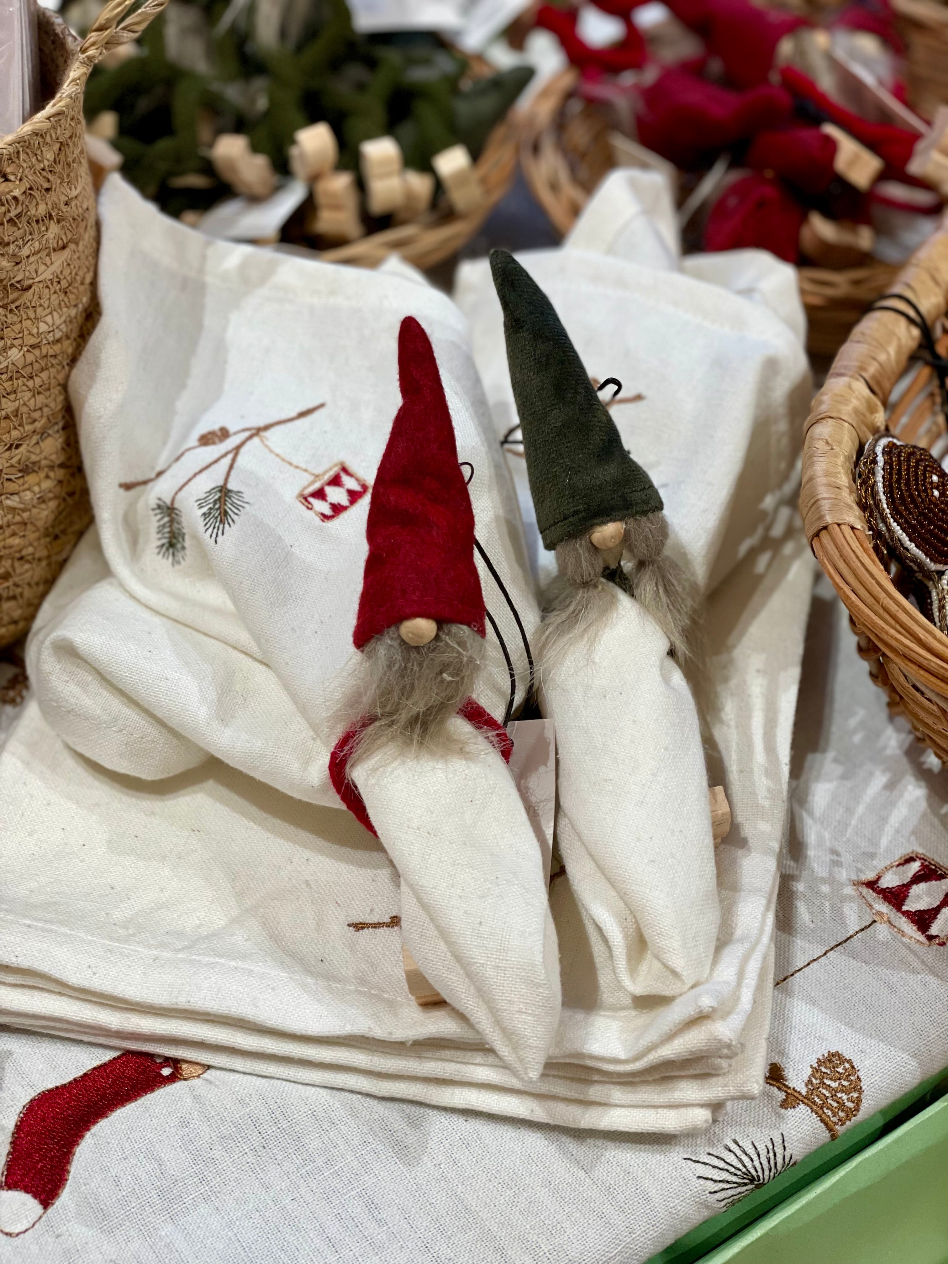 Fine Kaj og Line nisse servietring. Benene kan skilles ad og vikles om servietter eller om kranse. Eller sæt en nisse rundt om en LED lys - der er mange muligheder for Kaj og Line.