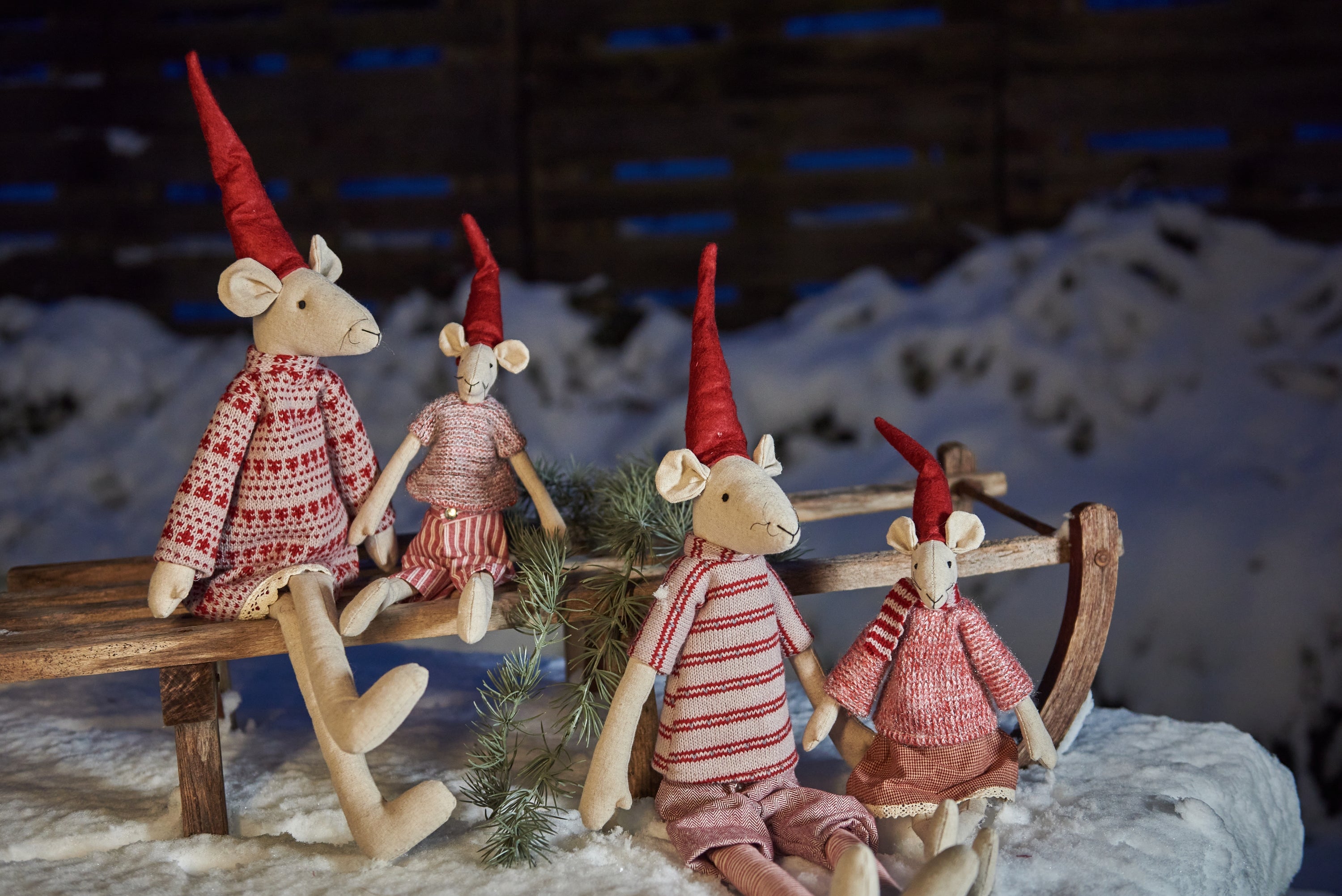 Søde store nissemus med nissehuer. Hyggeligt julepynt som spreder god stemning i julemåneden.