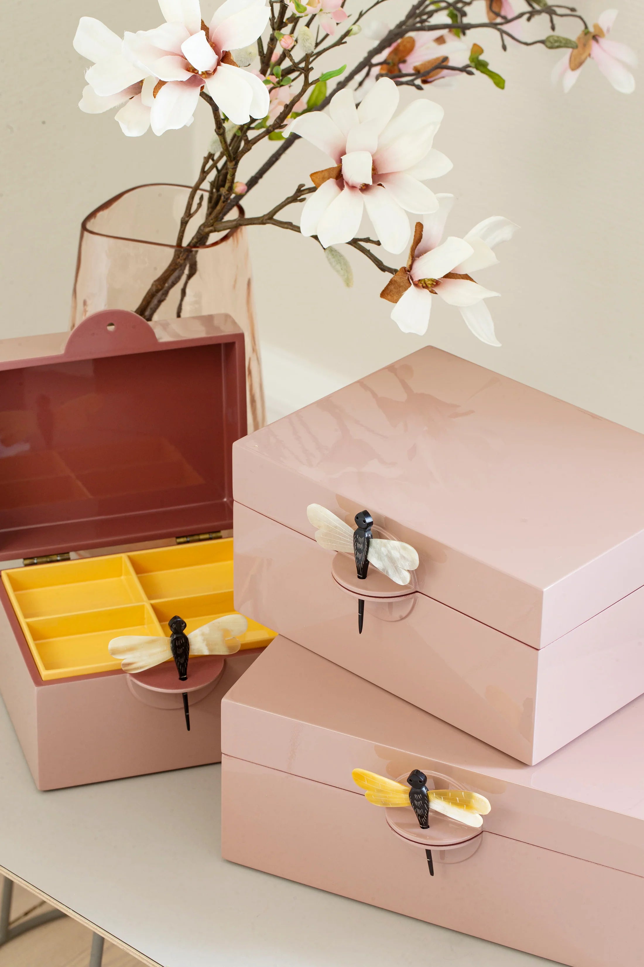 Super smukt smykkeskrin fra det Oi Soi Oi, der kombinerer elegance og funktionalitet. Hvert skrin er håndlavet og lakeret 13-15 gange for at opnå den høje kvalitet. De elegante smykkeskrin er den perfekte opbevaring til dine mest værdsatte smykker eller minder. Skrinene lukkes med en elegant og unik guldsmed lavet af bøffelhorn, der tilføjer et eksklusivt og luksuriøst præg. Den dyrebare lakæske er ikke kun praktisk, men også så stilfulde og smuk at den fortjener at stå fremme. Smykkeskrinet er ideelle til at beskytte dine smykker, billeder, minder, babys håndaftryk og samtidig give et sofistikeret touch til dit hjem. "Dragonfly" smykkeskrinnet for et luksuriøs skrin, der både er smuk og holdbar - den perfekte gave til en du holder af.