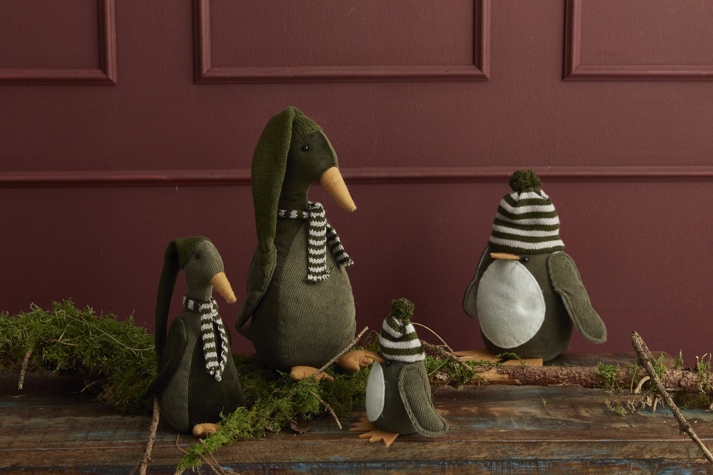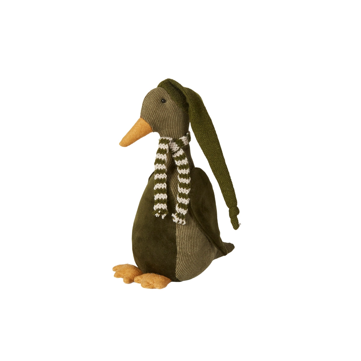 Skøn and med stribet halstørklæde og lang grøn hue.